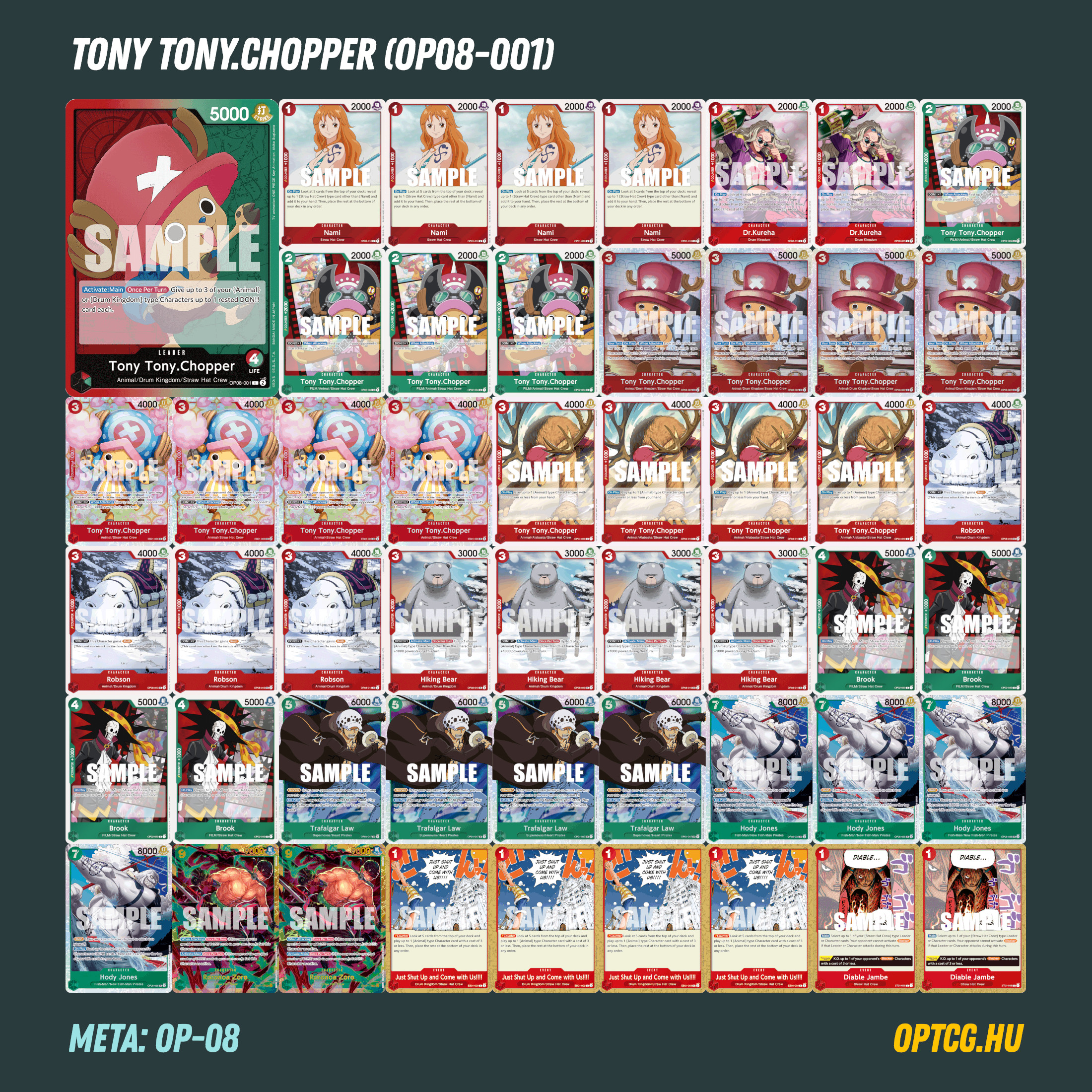 Tony Tony.Chopper (OP08-007): Az agresszív piros deckek új, megkerülhetetlen sztárja. Kijátszása körében rögtön előránt nekünk egy plusz testet, utána pedig azonnal foglalkoznia kell vele az ellenfélnek, különben további lapelőnyhöz juttat bennünket. Ő az, akit mindenképpen kint szeretnénk látni a játék elején.