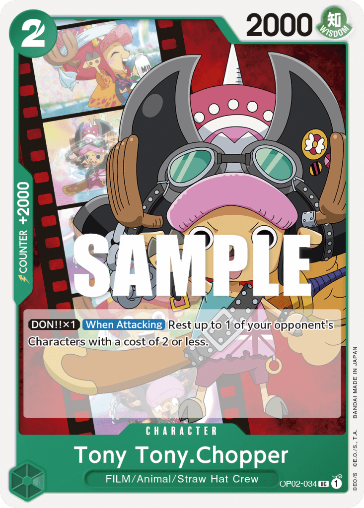 Tony Tony.Chopper (OP02-034): Még egy 2K counter. Ő már kevésbé hasznos az asztalról, de ha kell, esetleg be tud forgatni valami kisebb blockert – még ha ezek mostanság nem is túlságosan jellemzőek.