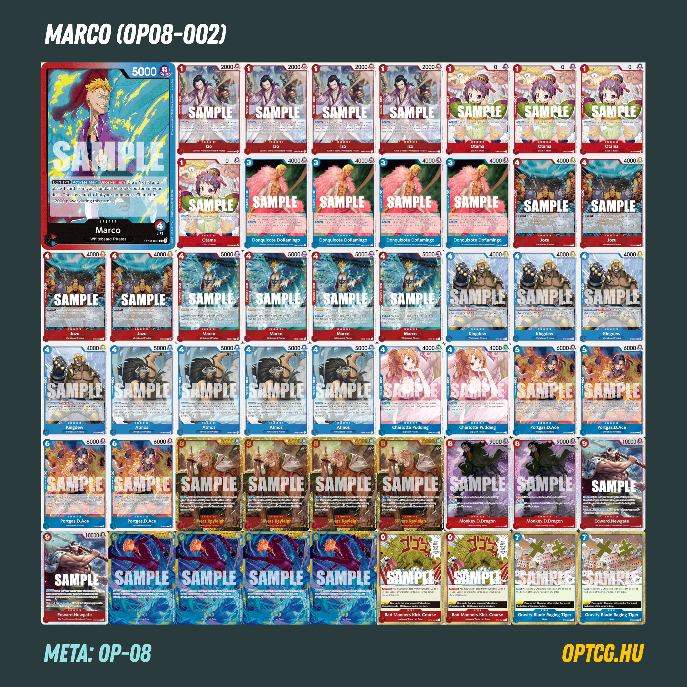 Marco (OP02-018): Kijátszásakor nem csinál semmit, nem is üt sokat, de még mindig egy elég zavaró lap, hiszen az ellenfél nehezen tud megszabadulni tőle – már ha van annyira fontos, hogy dobáljuk neki a lapokat. És gyakran megéri neki, hiszen ha utána tud menni swingelni, akkor szépen visszadolgozhatja a laphátrányt – blockerként amúgyis kicsit bizonytalan, de azért nem elhanyagolható ez a funkciója sem természetesen.