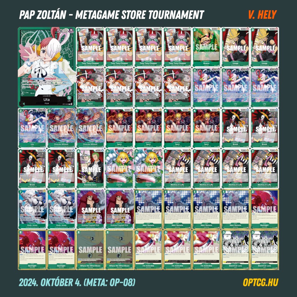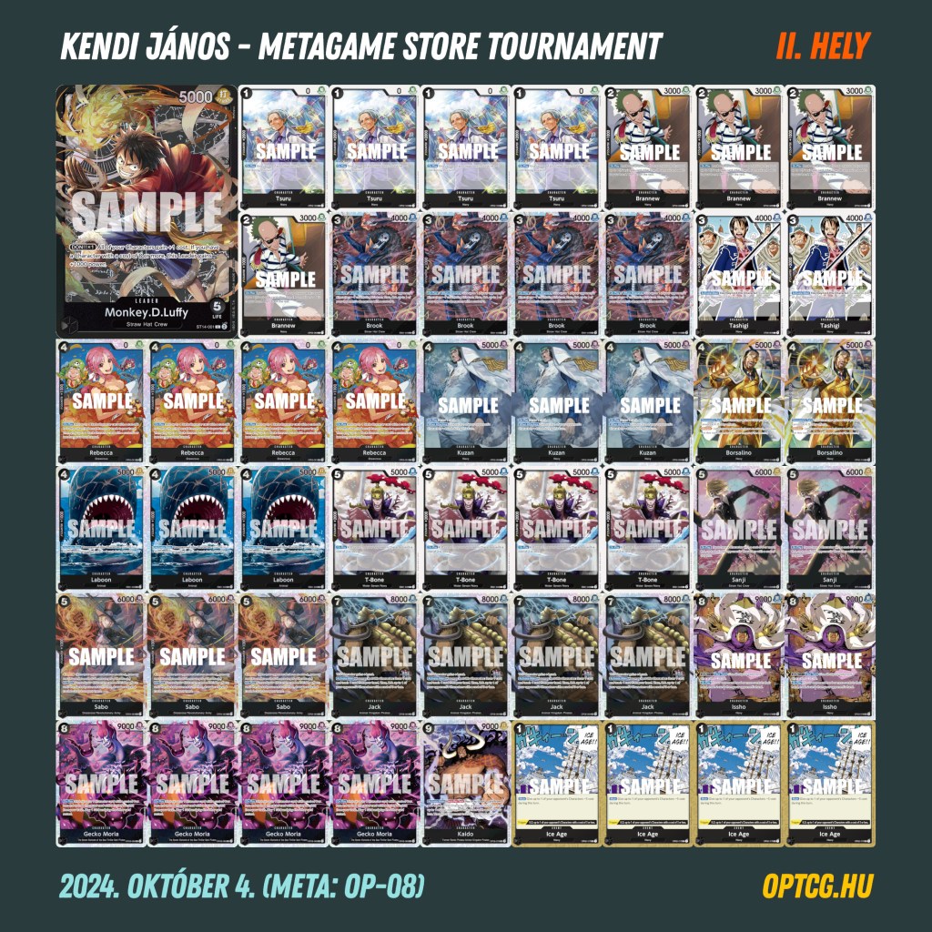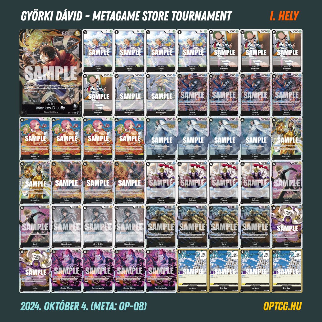 Amíg a szerdai versenyen sikerült feltartóztatni az ST-14 Luffykat, addig pénteken már nem volt, aki megállítsa őket: az első helyezett Györki Dávid és a másodikként végző Kendi János is a legújabb Leaderrel játszott. Egy Zoro azért beért a harmadik helyre Makó Gergely révén, így most is ezek a paklik sajátították ki az élmezőnyt, mögöttük pedig egy-egy lila Luffy, illetve Uta végzett még egy vereséggel.
