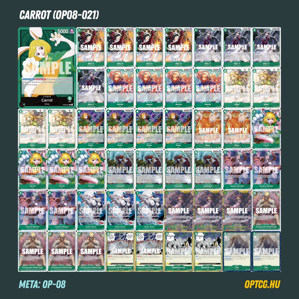 Carrot (OP08-023): Meg is érkeztünk a deck legjobb lapjához, aki maga is Carrot, és nevéhez híven szépen megrépázza az ellenfél karaktereit. Már kijátszásakor aludni küld valakit, és ha nem tudnak kezdeni vele valamit, akkor végig sakkban tud tartani egy karaktert, csak a boss kategóriás lapoknak van menekvése előle. Őt kell megpróbálni életben tartani, amíg csak tudjuk – a 6000-es test szerencsére nem rossz kiindulási alap, és lesznek rá izgalmas kombóink is…