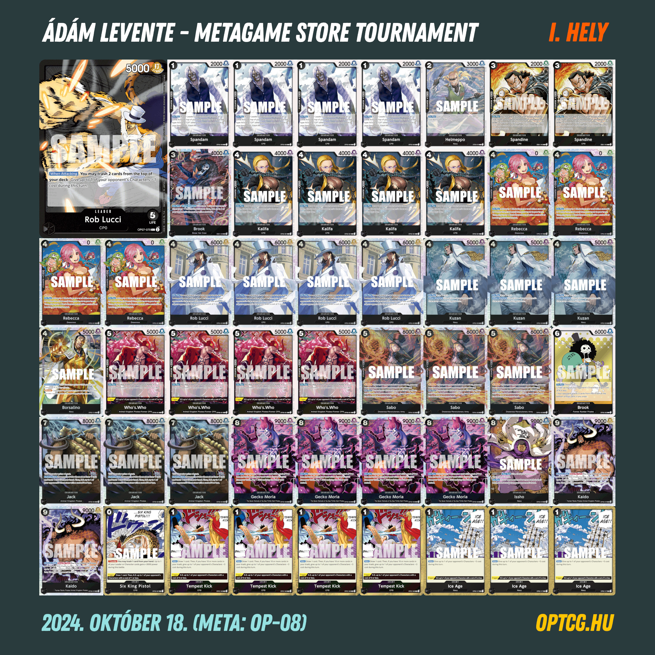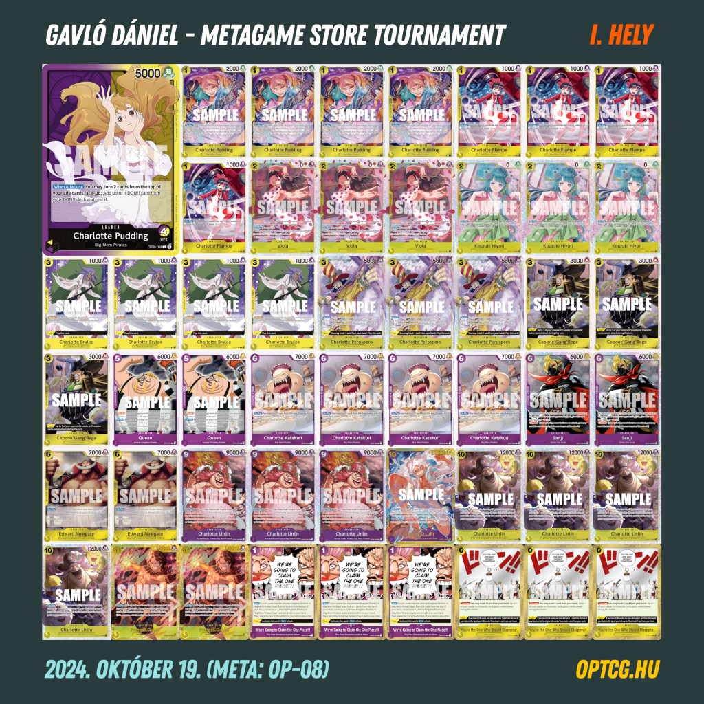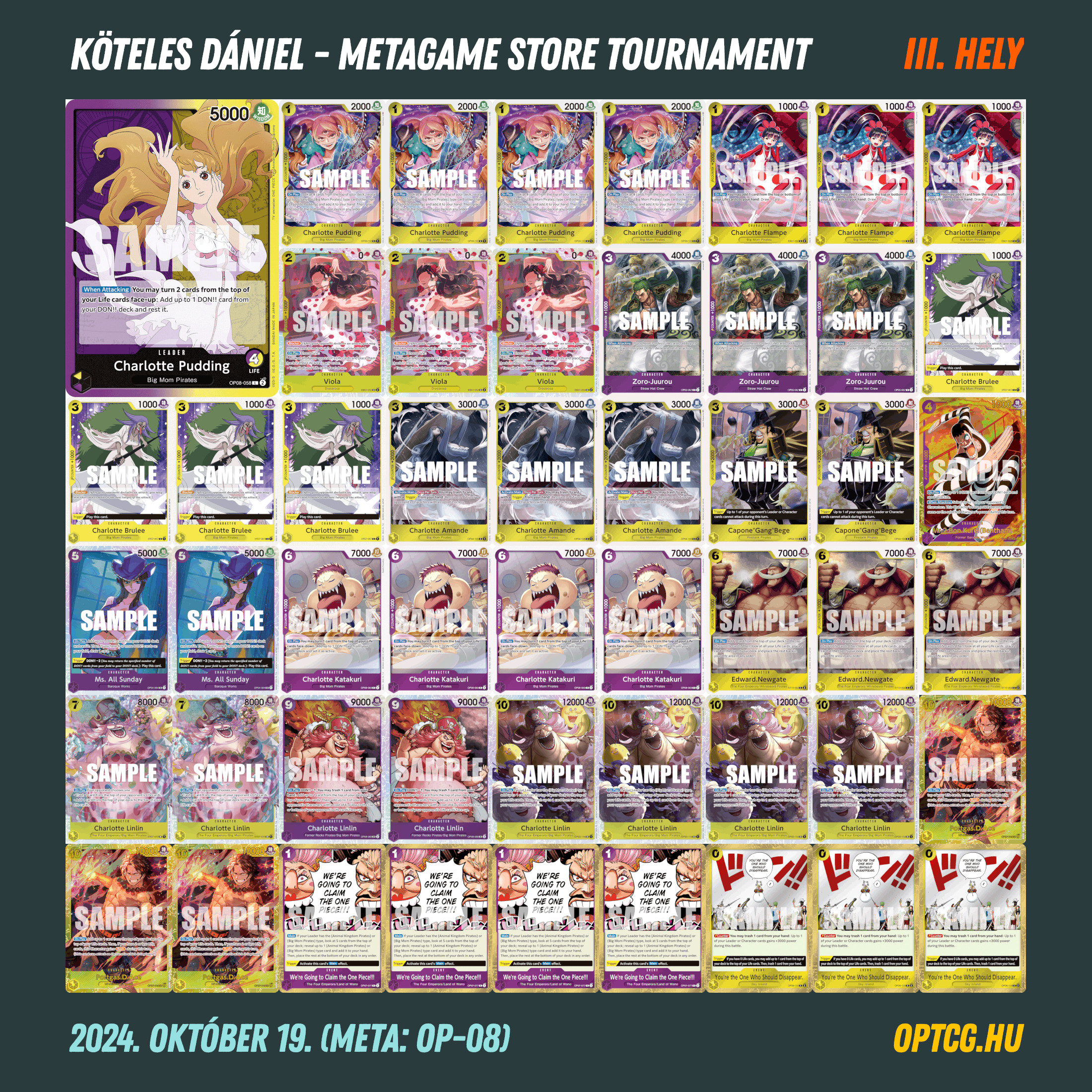 Másnap következett a Metagame pontgyűjtős versenysorozatának első állomása, amin 20 játékos vett részt. Itt szintén négy fordulót rendeztek, a finálé pedig egy mirror meccset hozott, méghozzá a váratlan fajtából, hiszen két Charlotte Pudding feszült egymásnak a döntőben. A győzelmet végül Gavló Dániel szerezte meg, ellenfele, Köteles Dániel a harmadik helyen végzett, közéjük pedig Török Tamás ékelődött be Enellel, erős napot zárt tehát a sárga szín. Mögöttük a fekete deckek sorakoztak a további 3-1-es helyeken: Ádám Levente és Kalenics Máté Luccival, Besenyei Martin pedig ST-14 Luffyval ért oda az élmezőnybe.