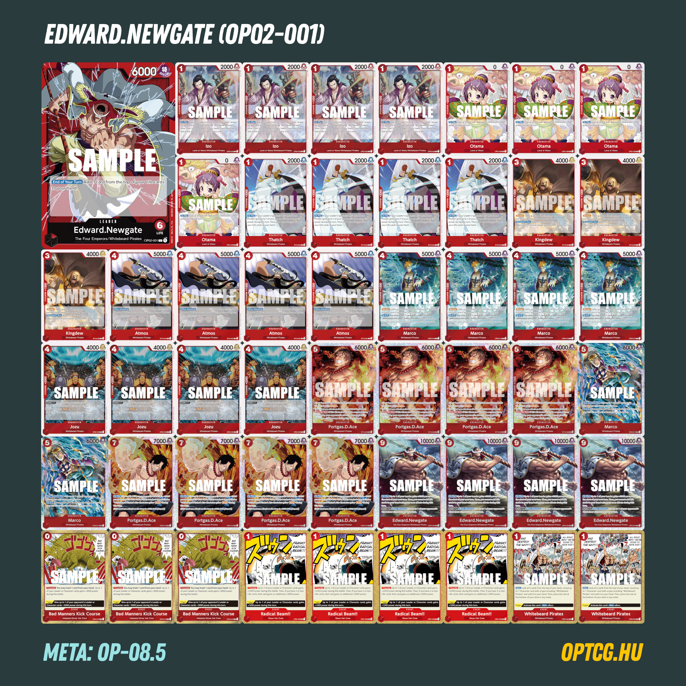 Edward.Newgate (OP02-004): Bár jól hangzik, hogy nincs Newgate pakli Newgate nélkül, azért ezt a tételt láttuk már egyszer-kétszer megdőlni. Most mindenesetre nem érdemes kihagyni, hiszen az ötödik körtől kezdve leginkább őt szeretnénk pakolgatni, hogy extra védelmet adjon nekünk: a 8K-s Leader komoly fejtörés a legtöbb deck számára, mint ahogy az sem hátrány, hogy nem kell lemennünk vele 0 Life-ra, ha sikerült megőrizni némi életet, ami mindig ad egy kis extra biztonságot. A K.O. effektjét pedig több lappal is ki tudjuk terjeszteni nagyobb hatáskörre.
