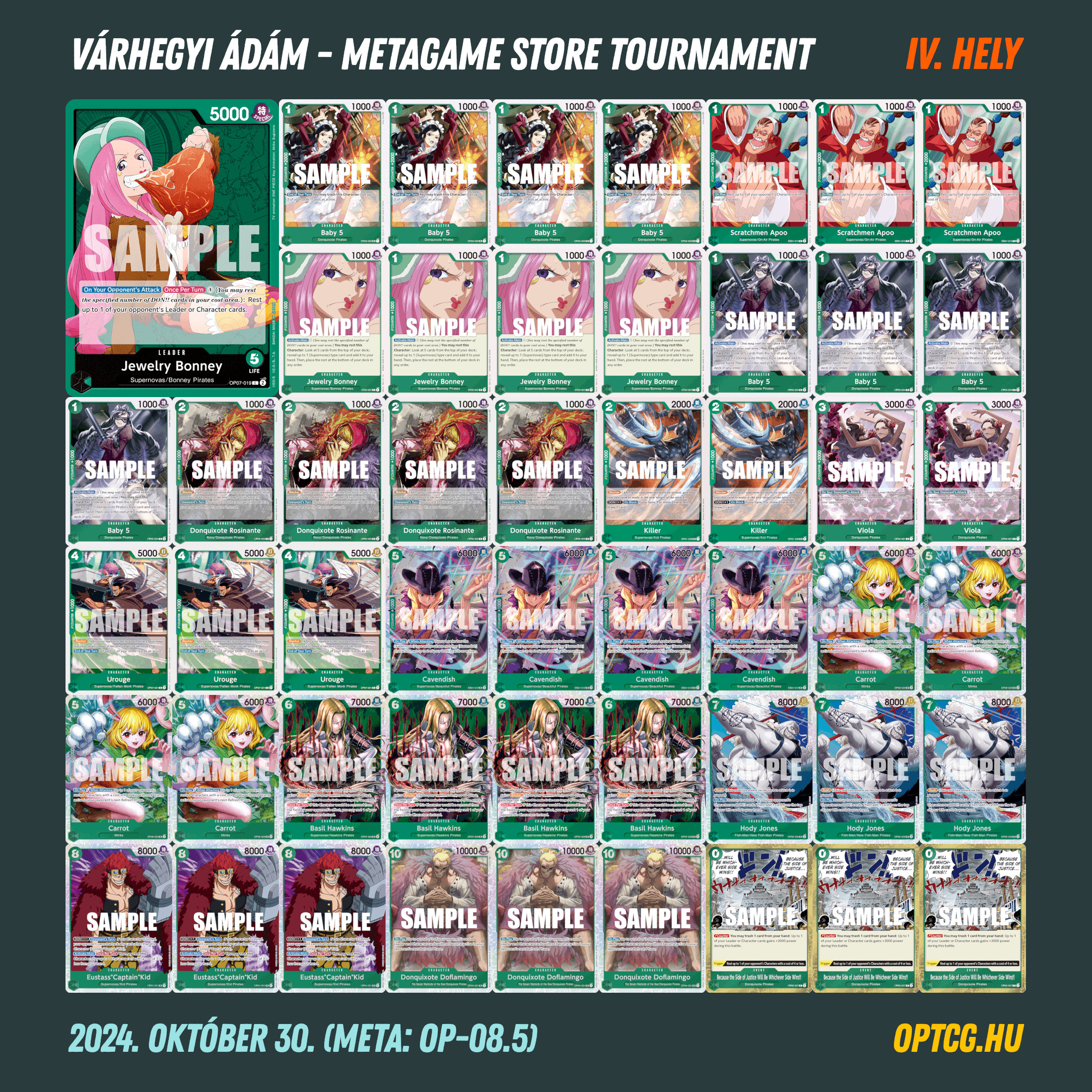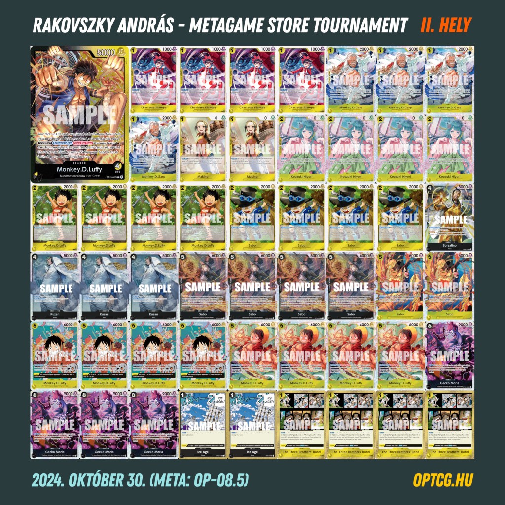 Az ötfordulós verseny végül Havasi Zsombor győzelmével zárult, aki az ST-18-cal komoly erősítést kapó lila Luffyt vezette győzelemre. Mögötte egy vereséggel a 08-as meta meghatározó deckjei sorakoztak egy-egy BY Luffy, Lucci és Bonney képében, valamint egy másik Pluffy is odaért az X-1-es helyekre.