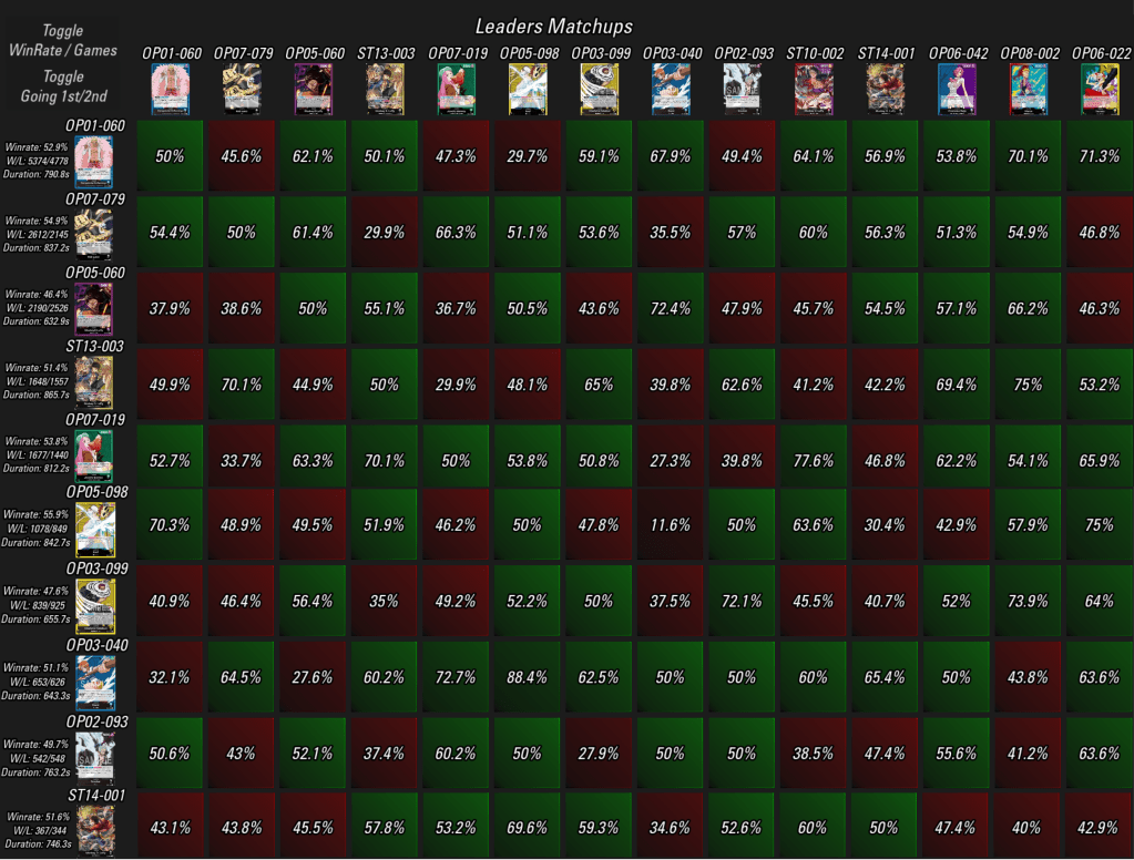 A TCG Match Making közzétette legfrissebb kivonatát a One Piece Card Game aktuális metájára vonatkozóan, melynek alapját az OPTCGSim ranked módja, az OPBounty adja. Rovatunkban mi is kizárólag a publikusan elérhető információkra hagyatkozunk – aki még részletesebb statisztikákra kíváncsi, az támogassa őket a Patreonon, és hozzáférést kap a bővebb adattáblához.