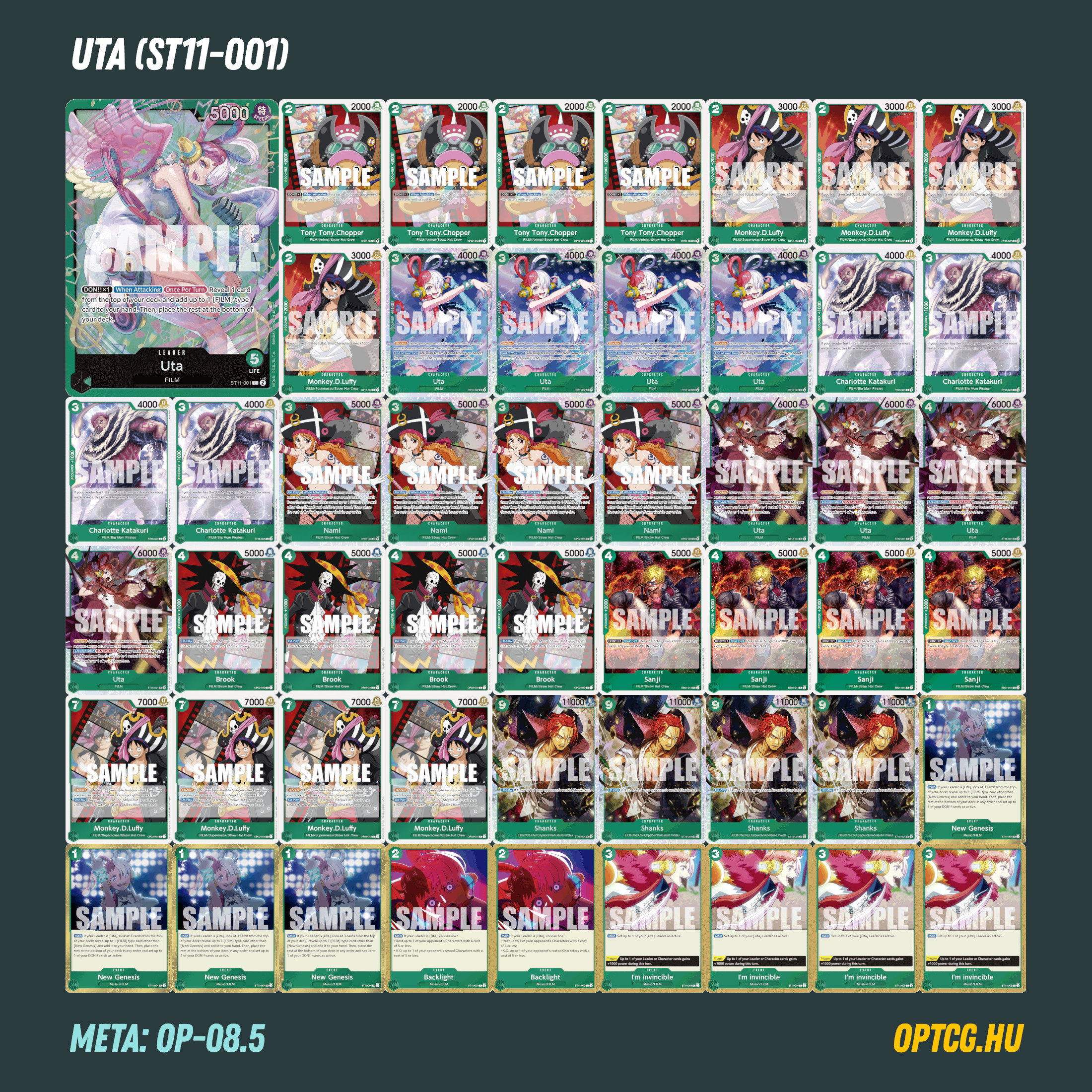 Uta (ST11-002): Szintén remek kombináció Brookkal, ha kell, akkor dupla védelmet nyújtva, hiszen nemcsak ő blocker, hanem fel is tud állítani valakit – tipikusan a 7-es Luffyt, hiszen ott a 7000-es swingeket sokszor megéri elsütni egy lapdobásért cserébe.