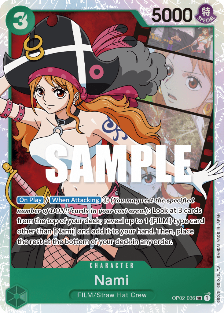 Nami (OP02-036): A Leader mellett a deck másik motorja, már ami a laphúzást illeti, mivel folyamatos utánpótlást biztosít, így őt mindenképpen érdemes megvédeni, ameddig csak racionálisan lehetséges, hiszen jócskán meghálálja nekünk, ráadásul Brook ki is tudja rakni.