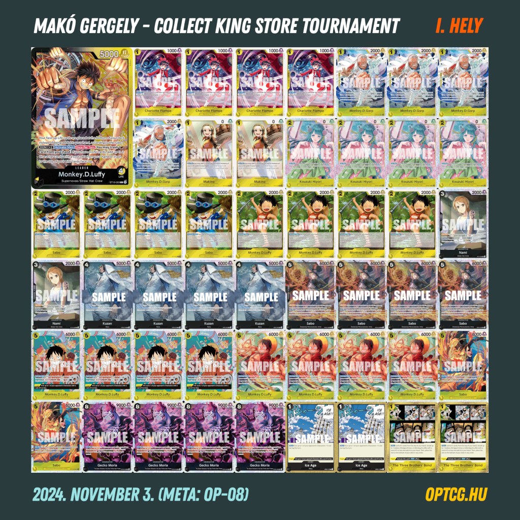 Stílszerűen a 8.0-s meta három talán legnagyobb csúcsragadozója, a BY Luffy, Lucci és Nami zártak tehát az élmezőnyben. A paklilistákat lent böngészhetitek.