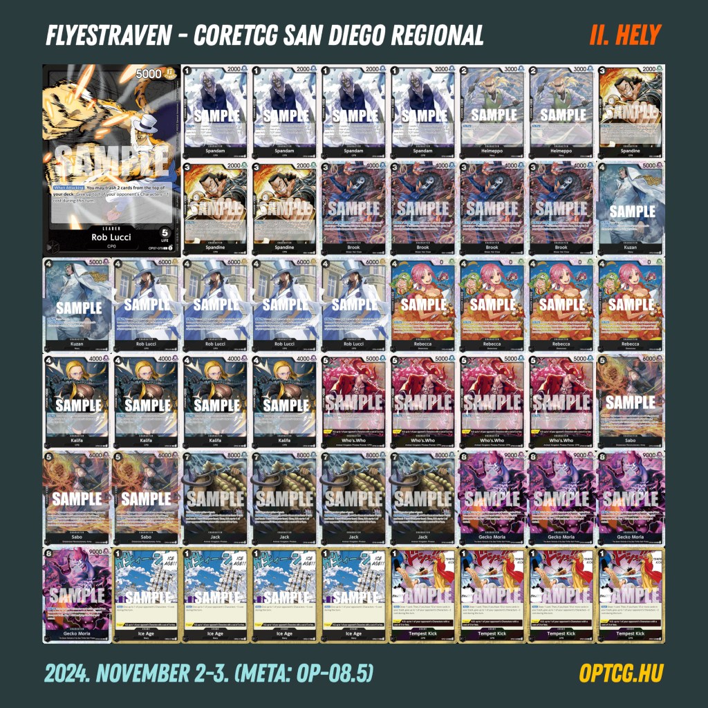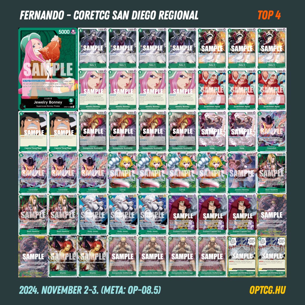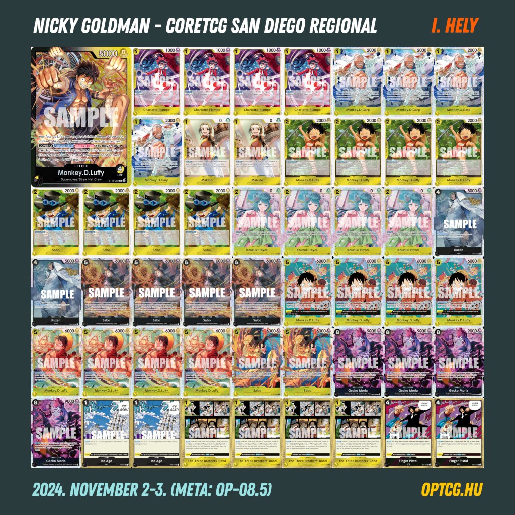 A versenyt végül Nicky Goldman nyerte BY Luffyval, folytatva a pakli sikerszériáját – a CoreTCG októberi online regional versenyét megnyerő FlyestRavent győzte le a döntőben, aki ezúttal is Luccizott. A Top 4-ig egy-egy Doffy és Bonney jutott még el, ezeket a listákat lentebb láthatjátok.