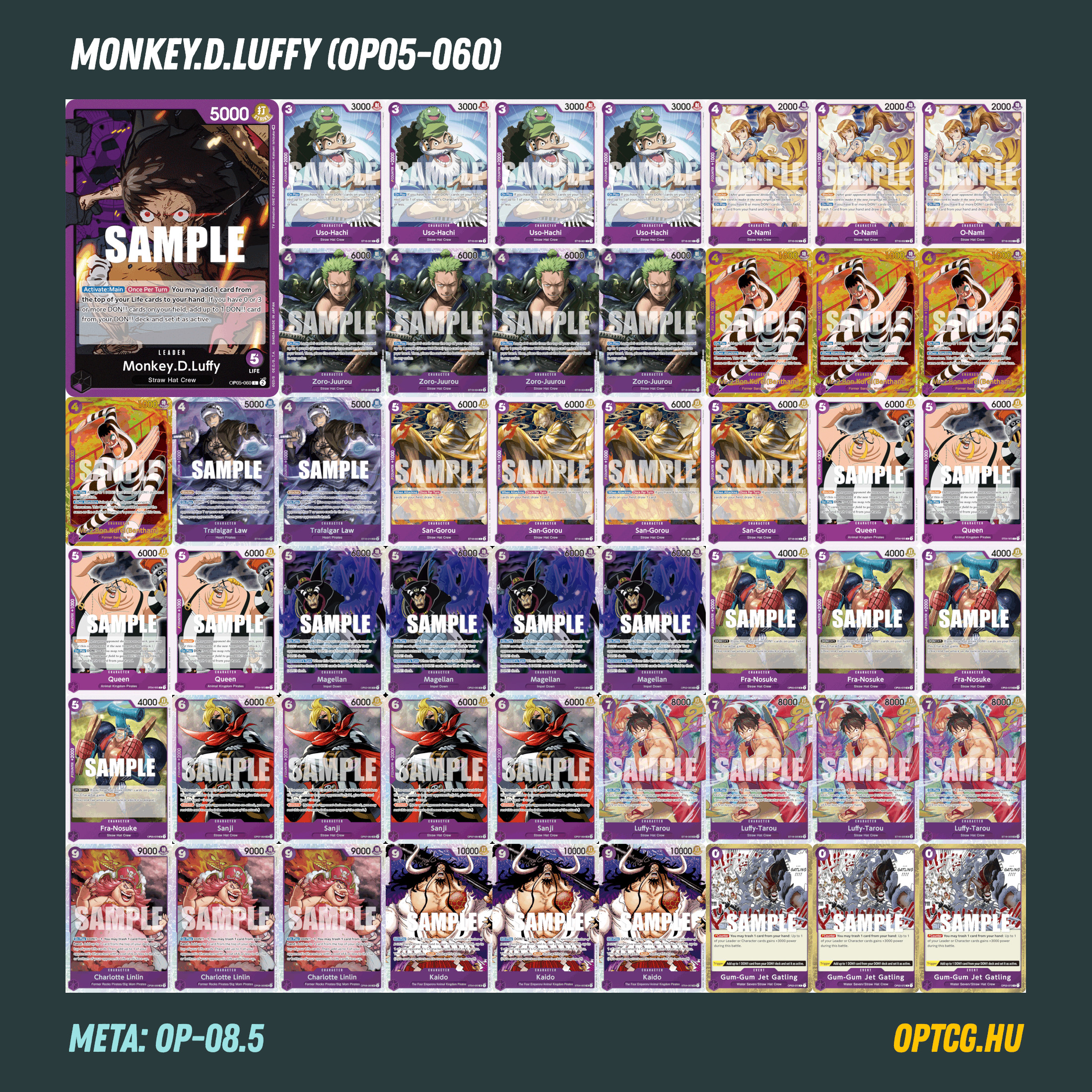 Mivel a lila színnek nagyon sok univerzális lapja van, ezért bőven van lehetőség alakítani a decken, de a Straw Hat-csomaghoz komolyabban nem érdemes hozzányúlni, mivel ez adja a pakli konzisztenciáját. Egy szó mint száz: kísérletezzetek vele bátran, hiszen egy olyan Leaderről beszélünk, aki egyértelműen meghatározó lesz a következő félévben!