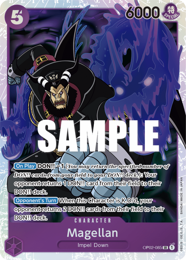 Magellan (OP02-085): Ő nem rampel, hanem DON!!-t pusztít, de a végeredmény ugyanaz: az ellenfél jókora hátrányban fogja érezni magát. Ha hátul megyünk, akkor iszonyatosan fájdalmas megkapni a második körben, hiszen utána az ellenfél újból csak 4 DON!!-ból építkezhet, miközben ott van ez a 6000-es test, amivel valamit kéne kezdeni, de a K.O. nem jó megoldás rá. A későbbi körökben már nem ilyen zavaró lap, de a korai játékban mutatott ereje miatt így is megéri játszani vele.
