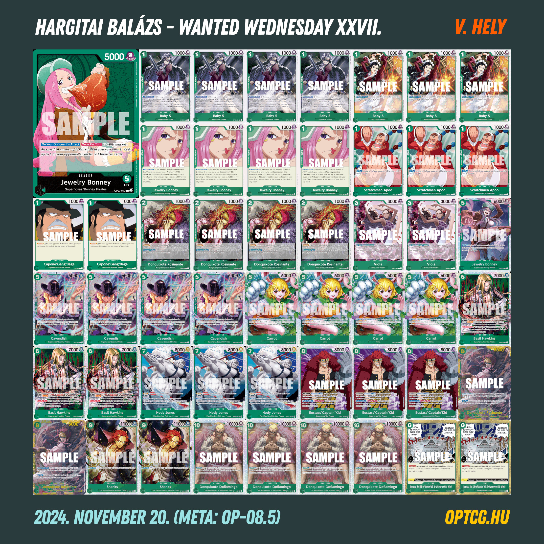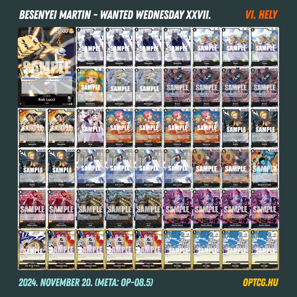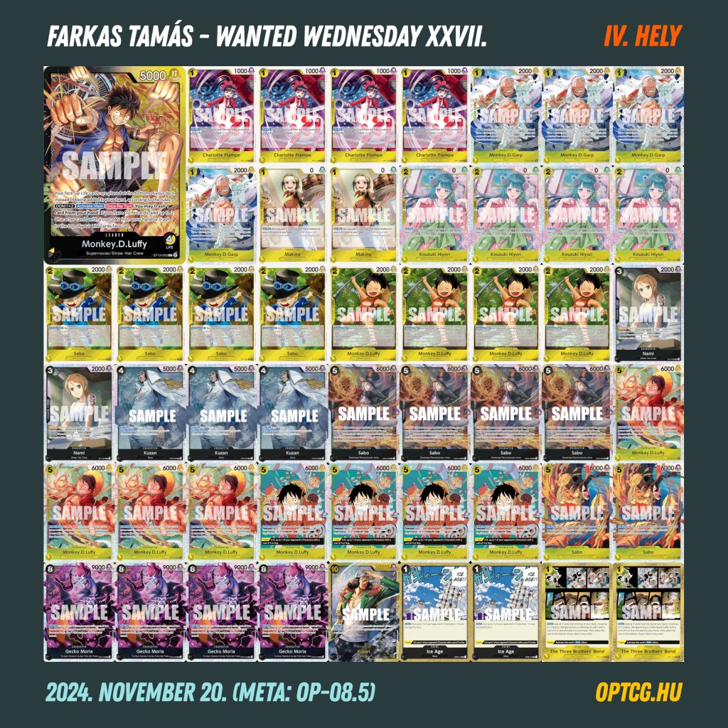 Az ötfordulós verseny Nagy Dániel győzelmét hozta, aki először vihetett így haza playmatot a “kívánós szerdákról” – kedvenc Rob Lucciját kormányozta be az első helyre. A 4-1-es pozíciókba ezúttal nem fért be egyetlen meglepetésdeck sem, sőt, igazából csupa Tier 1 pakli sajátította ki az élmezőnyt (a magyar metában egyébként szokatlan módon), két-két Luccival, BY Luffyval és Bonneyval, valamint egy kék Doffyval.