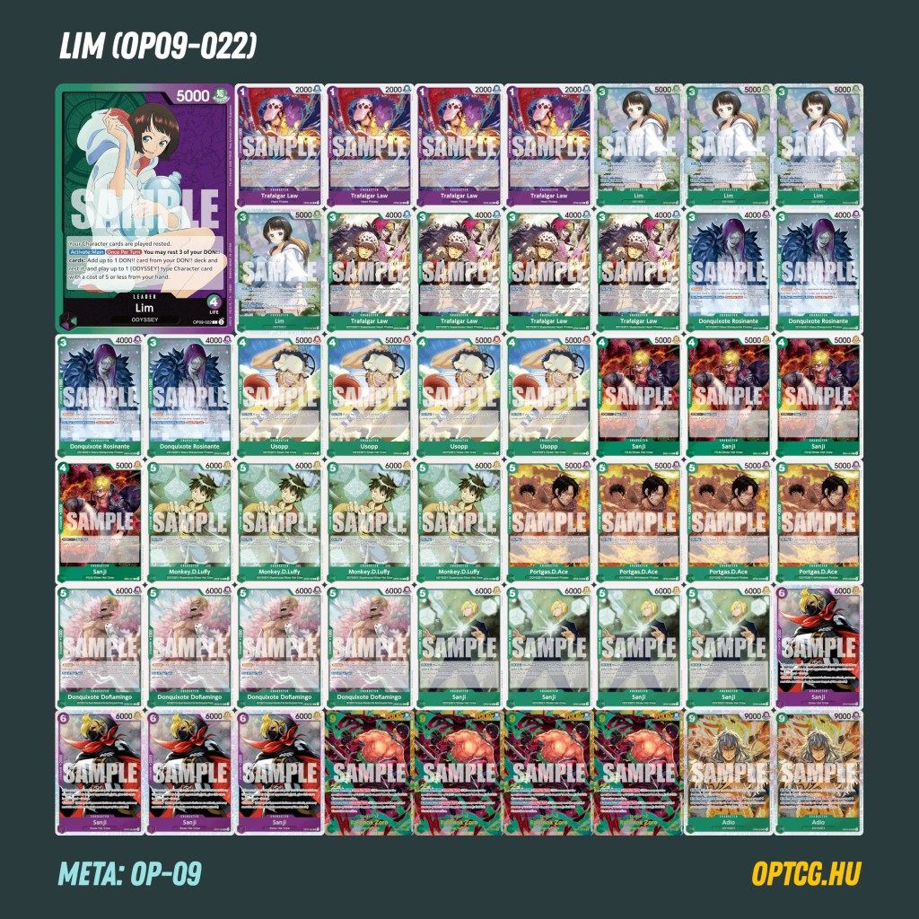 Lim (OP09-037): Releváns testbe épített kereső, aki a játék későbbi szakaszában akár még aktív is tud lenni – addig pedig úgy érdemes számolni vele, hogy a megvédésére el is megy a lapelőny, így tulajdonképpen 3-ért 5000, ami elvitt egy ütést az ellenféltől.