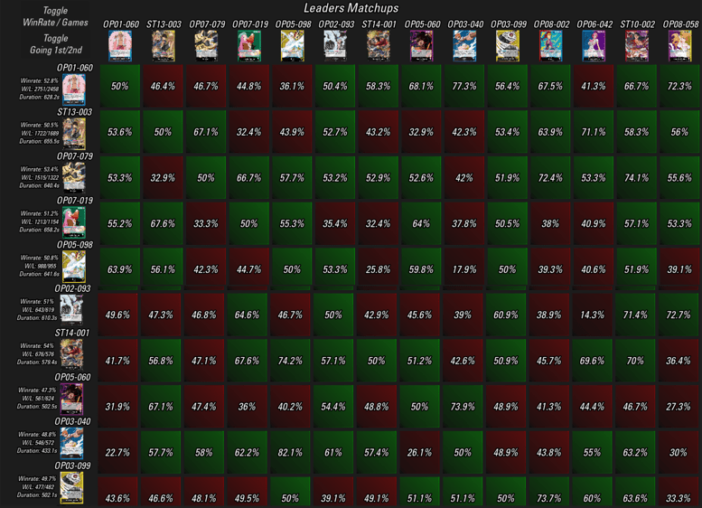 A TCG Match Making közzétette legfrissebb kivonatát a One Piece Card Game aktuális metájára vonatkozóan, melynek alapját az OPTCGSim ranked módja, az OPBounty adja. Rovatunkban mi is kizárólag a publikusan elérhető információkra hagyatkozunk – aki még részletesebb statisztikákra kíváncsi, az támogassa őket a Patreonon, és hozzáférést kap a bővebb adattáblához.