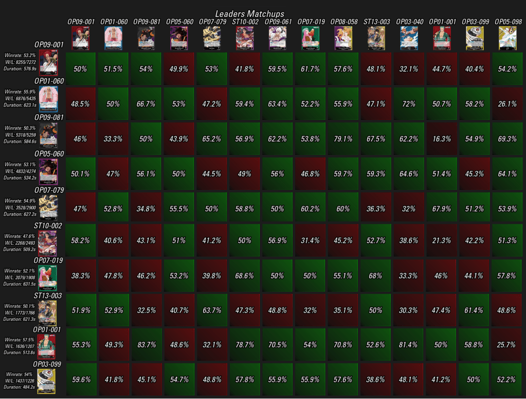 A TCG Match Making közzétette legfrissebb kivonatát a One Piece Card Game aktuális metájára vonatkozóan, melynek alapját az OPTCGSim ranked módja, az OPBounty adja. Rovatunkban mi is kizárólag a publikusan elérhető információkra hagyatkozunk – aki még részletesebb statisztikákra kíváncsi, az támogassa őket a Patreonon, és hozzáférést kap a bővebb adattáblához.