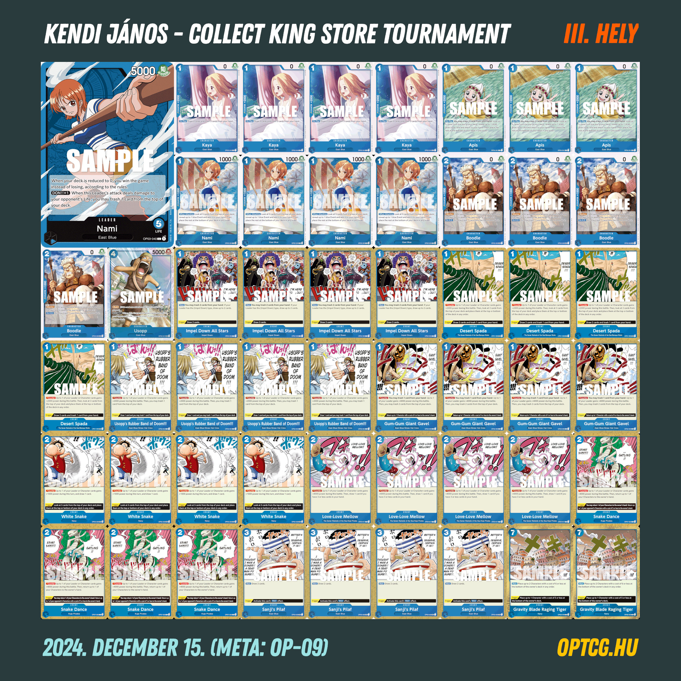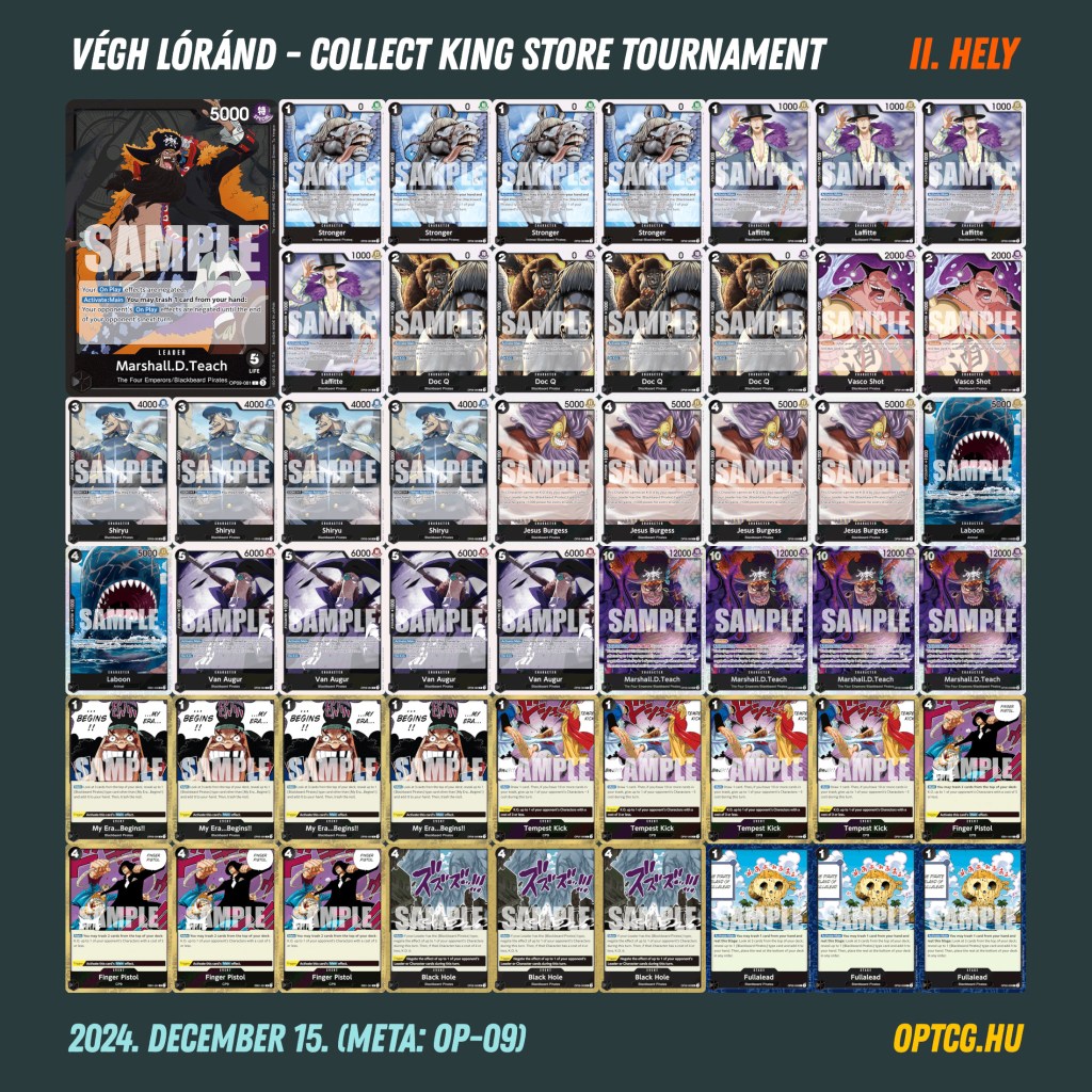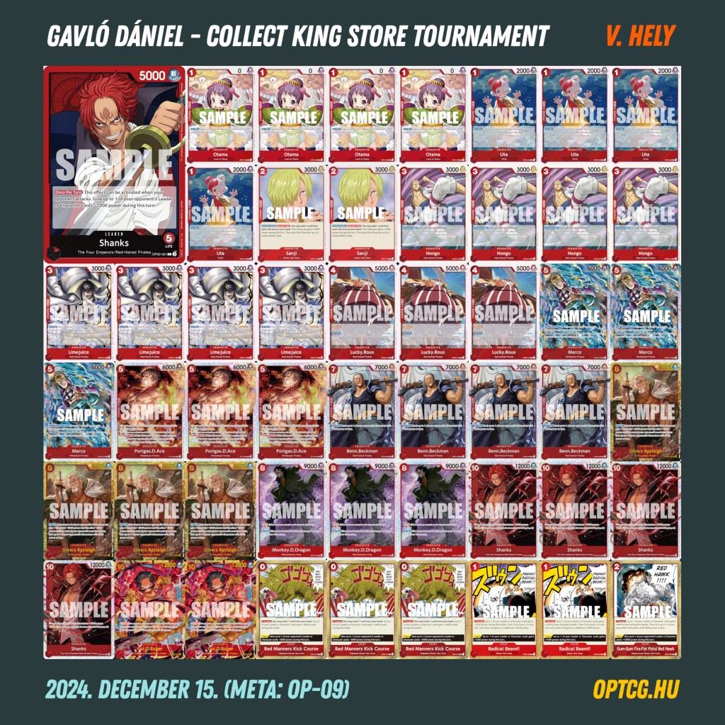 A győzelmet végül Ádám Levente szerezte meg lila Luffyval, a pénteki BP Luffy-siker után tehát ezúttal nem avattunk újonc győztest. Nem sok kellett hozzá ugyanakkor, hiszen a 3-1-es helyekre egy Teach és két Shanks is odaért, rajtuk kívül egy Nami és egy BP Luffy zárt még az élmezőnyben.
