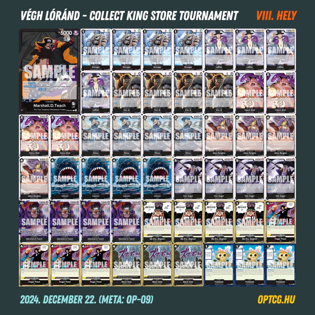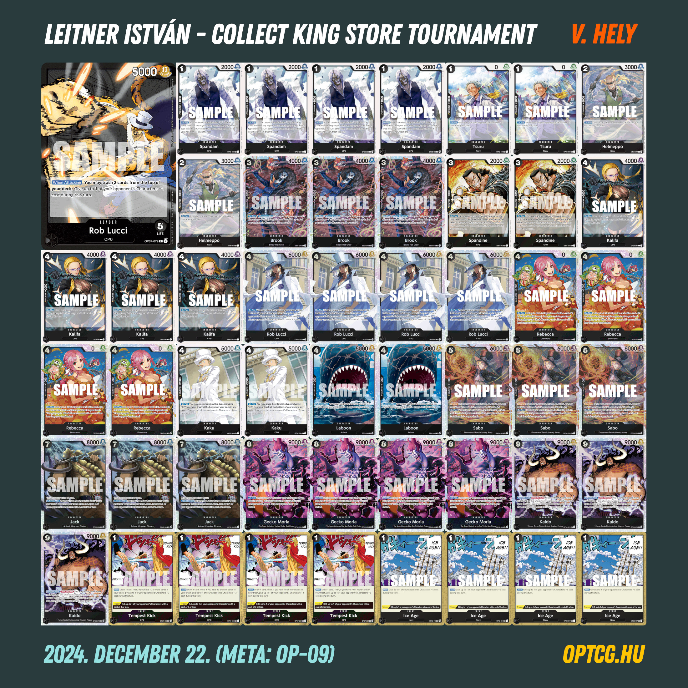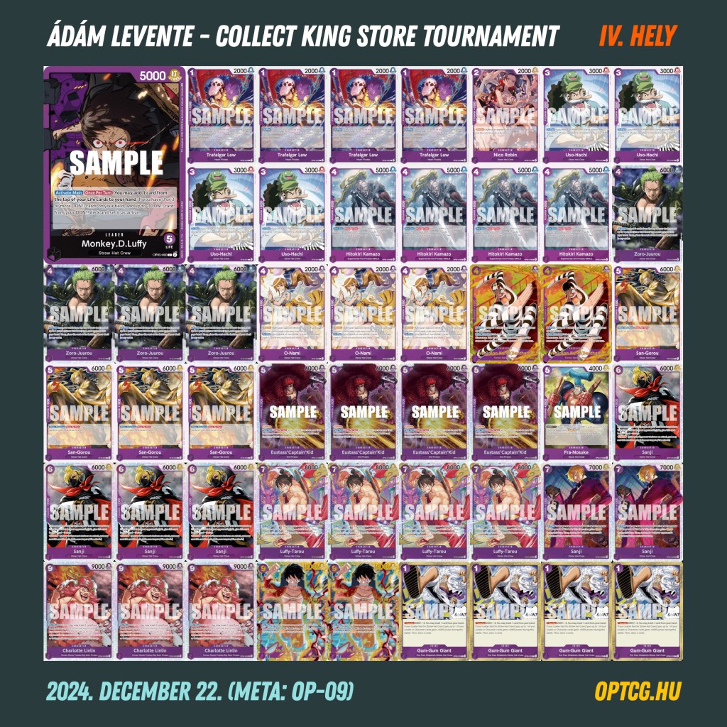 Érdekes széria alakult ki a hazai One Piece versenyeken az OP-09 metában, azok után ugyanis, hogy az első megmérettetést egy BP Luffy nyerte az új érában, a lila Luffy sorozatban három győzelemmel válaszolt, így eddig egyértelműen a lila szín a környezetváltás nagy haszonélvezője. December 22-én, vasárnap a Collect King versenyén azonban most újabb lehetőség adódott arra, hogy “szépítsenek” a többiek – 21 játékos próbálkozott meg ezzel. Íme a használt Leaderek: