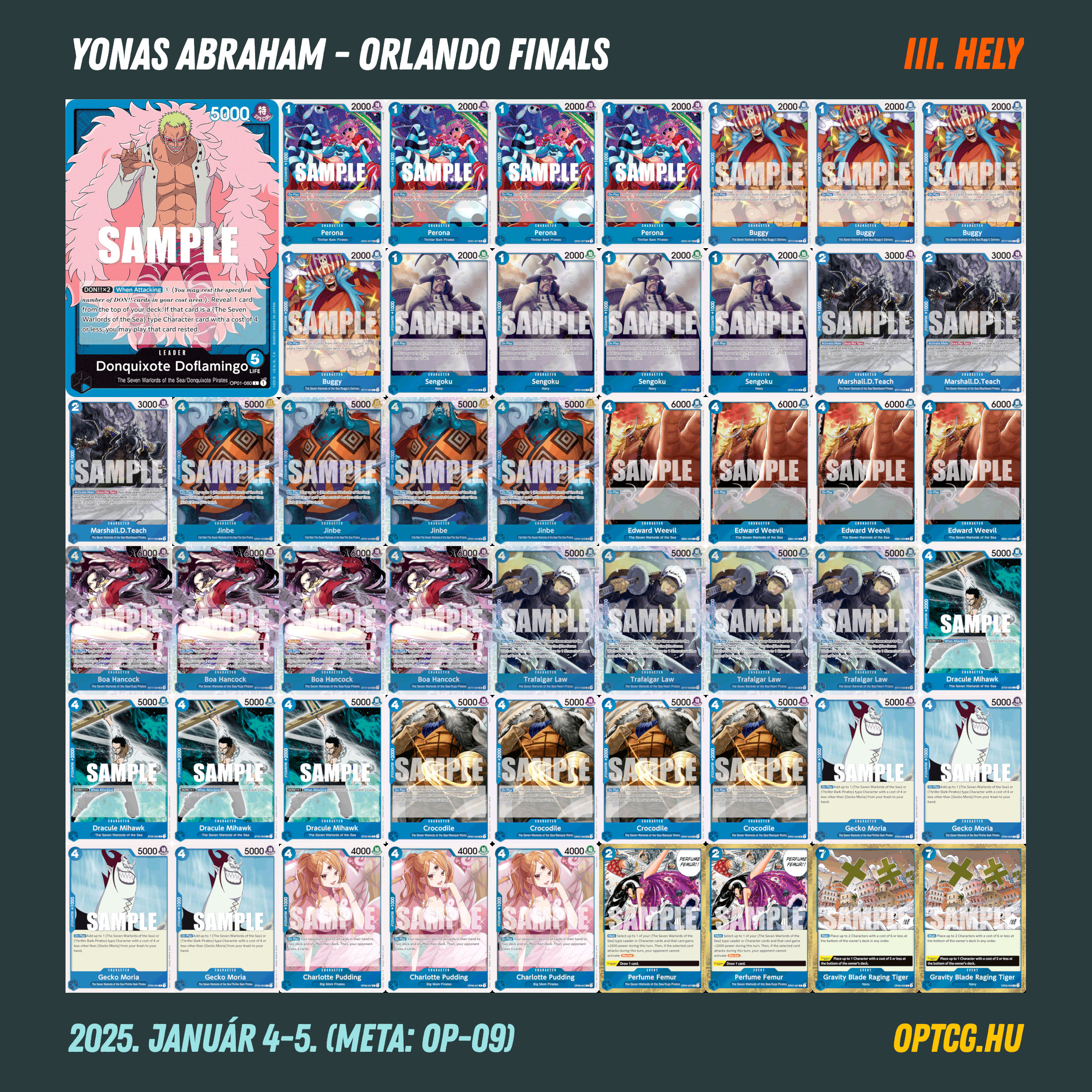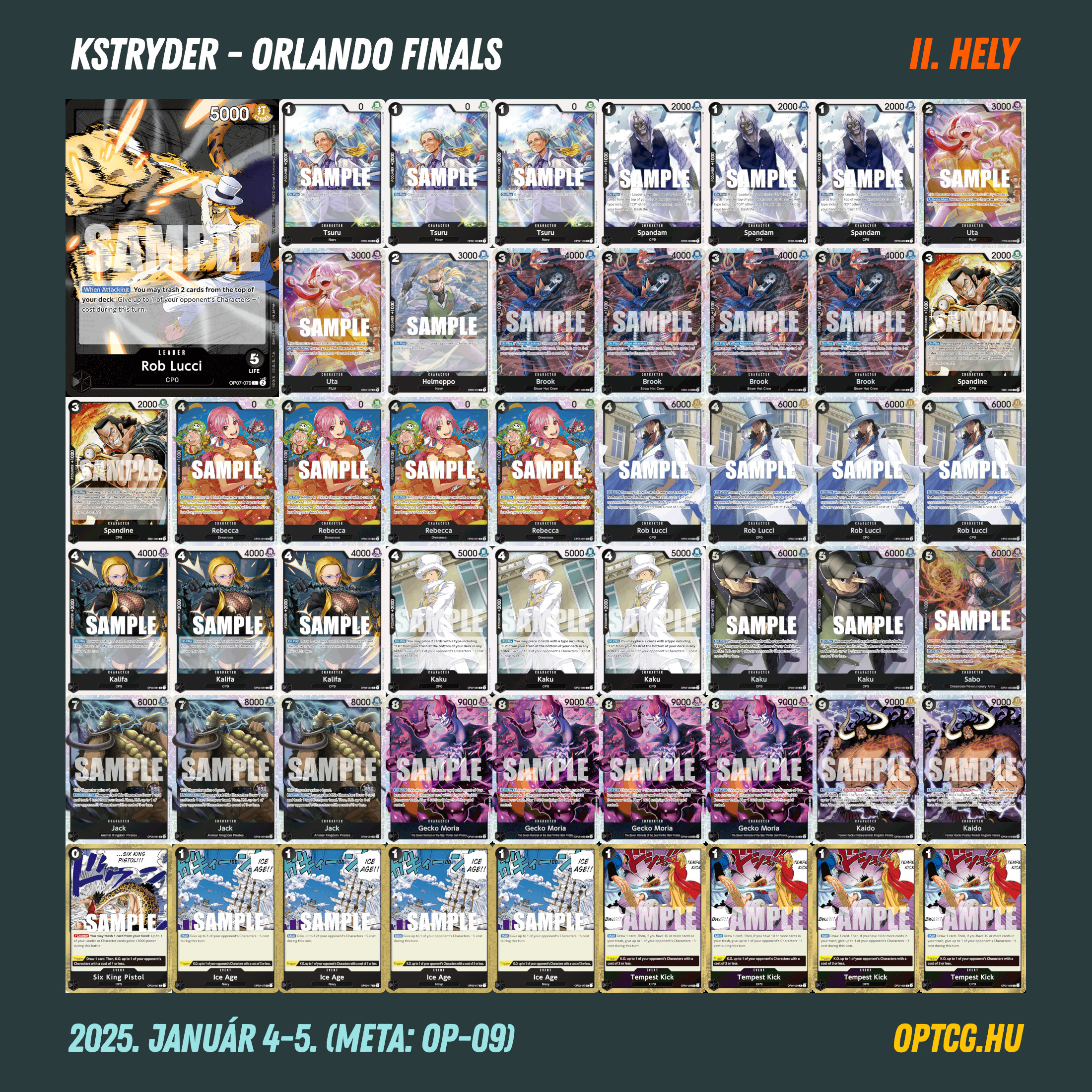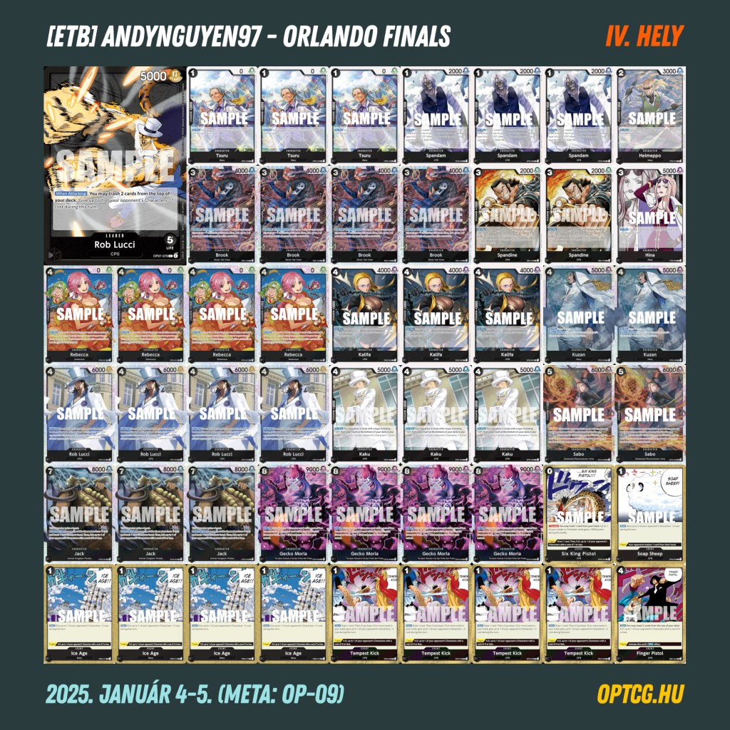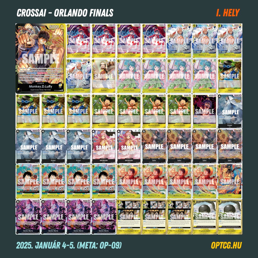 A döntőbe végül CrossAI (BY Luffy) és KStryder (Rob Lucci) jutottak el, így ők ekkor már biztosan kvalifikálták magukat a VB-re, de a Top 1 díjazásért azért még természetesen le kellett játszani ezt a mostanra klasszikusnak mondható párosítást, a győzelmet pedig a “dongó” Luffyval felálló CrossAI szerezte meg. A legjobb kék Doffy a harmadik helyen végzett, rajtuk kívül pedig még egy Rob Lucci fért még oda a Top 4-be – ezeket a paklilistákat lent láthatjátok.