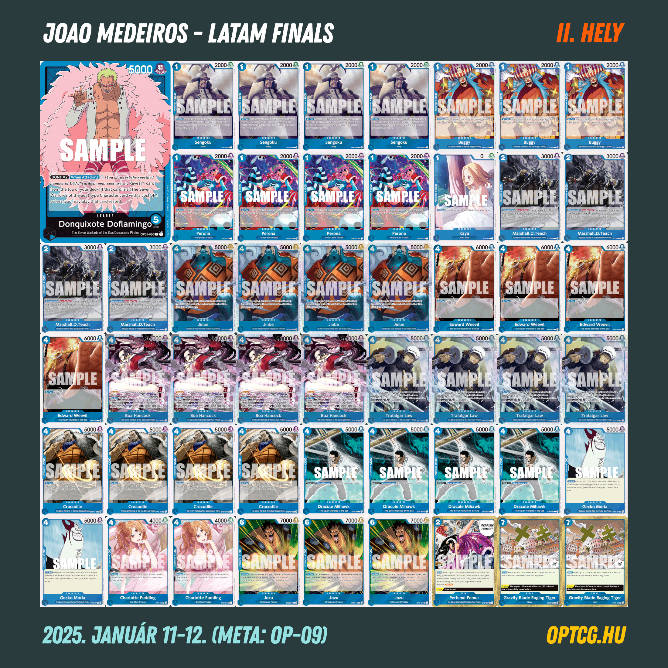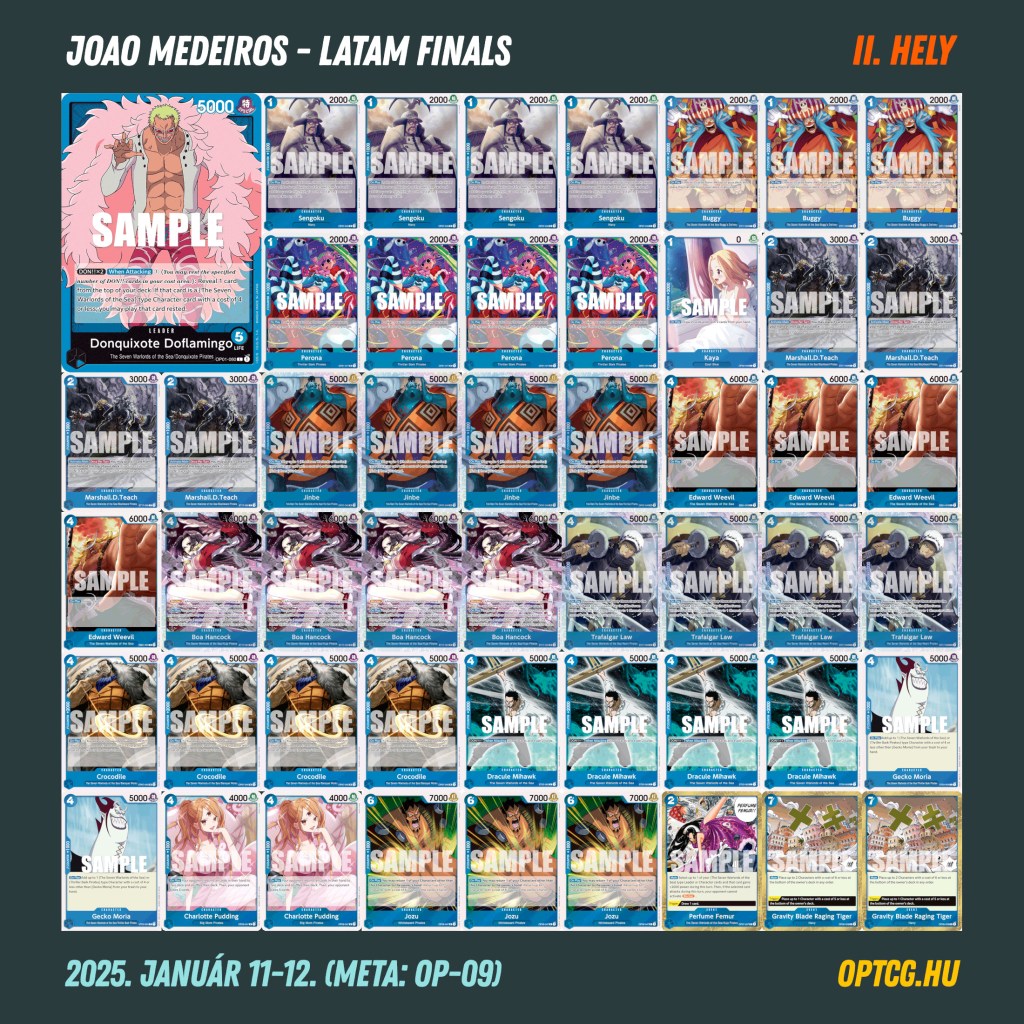 Az első nap 10 fordulós svájci rendszerű versenye után másnap a Top 64 folytathatta az egyenes kieséses top cutban, és bár akadt néhány meglepetés-Leader (többek között 2 Nico Robin is), a Top 16-ig végül 6 kék Doffy, 5 fekete-sárga Luffy, 2 lila Luffy, valamint 1-1 Shanks, Bonney és Enel jutott el.