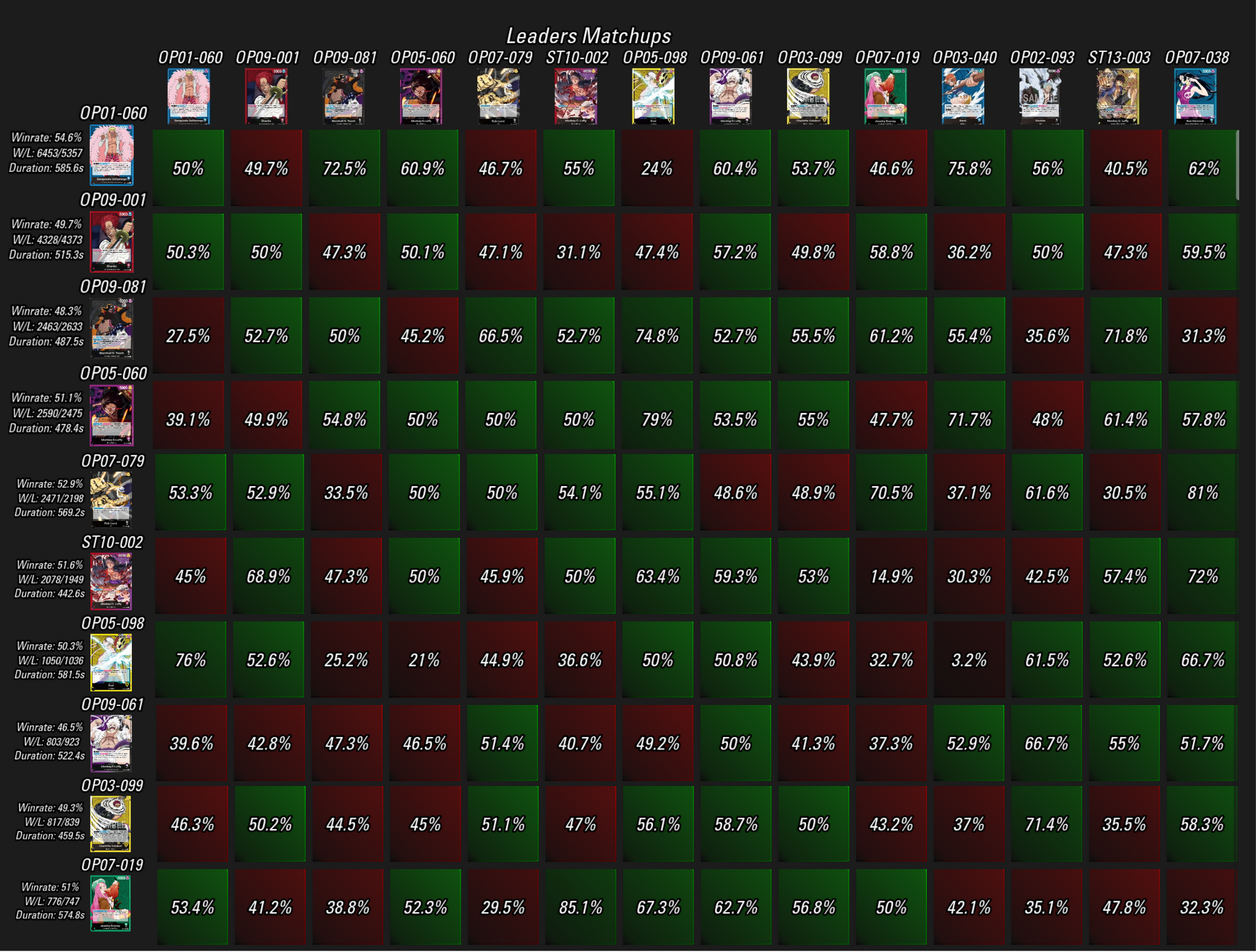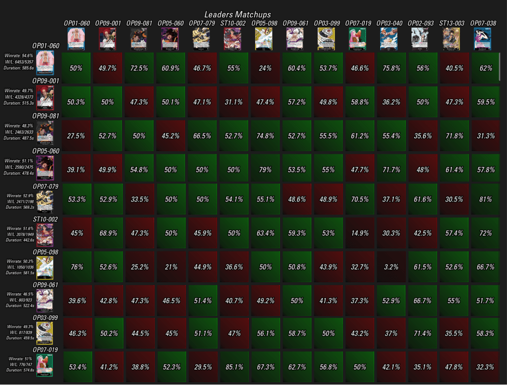 A győzelmi arányt tekintve Doffy tartja a tőle megszokott 55 százalék körüli mérleget, mögötte pedig Lucci és az RP Luffy következnek 52 százalék feletti winrate-tel. Rajtuk kívül Bonney, a lila Luffy, Katakuri és Enel teljesítettek még 50 százalék felett, Shanks már kicsit a “piros” tartományba lóg, Teach és a BP Luffy pedig jókora lemaradással következnek a Top 10 végén, már ami a legnépszerűbb Leadereket illeti.