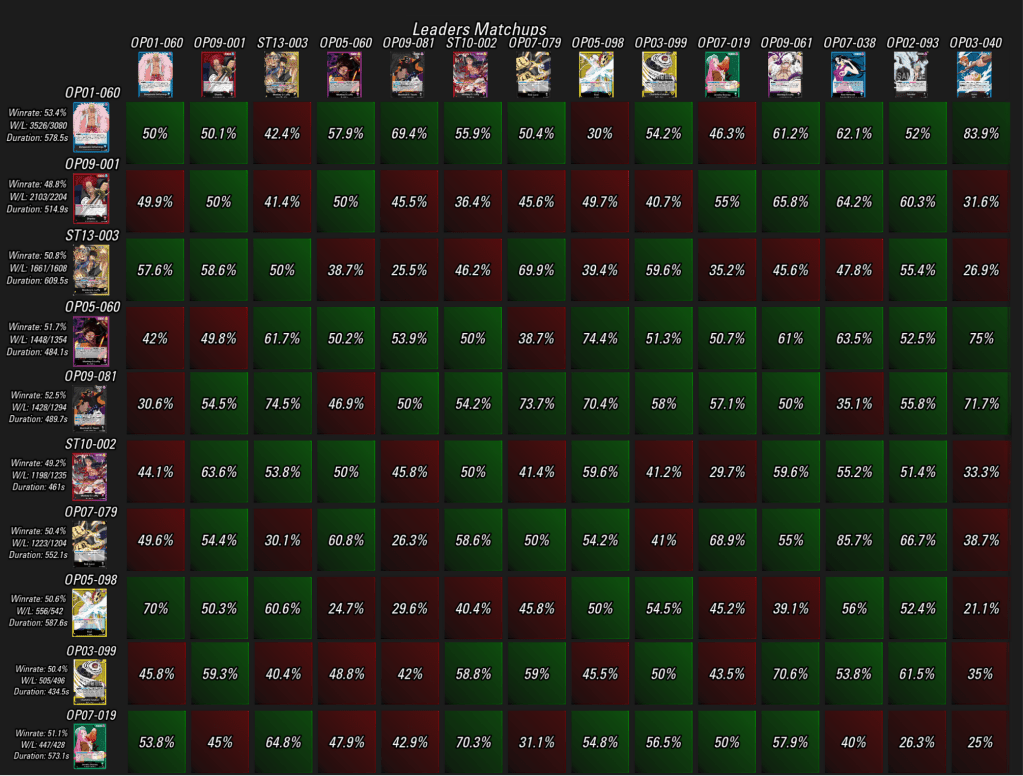 A győzelmi arányokat tekintve ezúttal viszonylag szoros az élmezőny, a kék Doffy 55% körülről visszaesett 53,4%-ra, Teach pedig most már 1 százalékponton belül követi őt. Összesen nyolc Leader teljesített 50% felett az elmúlt egy hétben a tíz legnépszerűbb paklit tekintve, az RP Luffy és Shanks már csak a “piros” tartományba fértek be.
