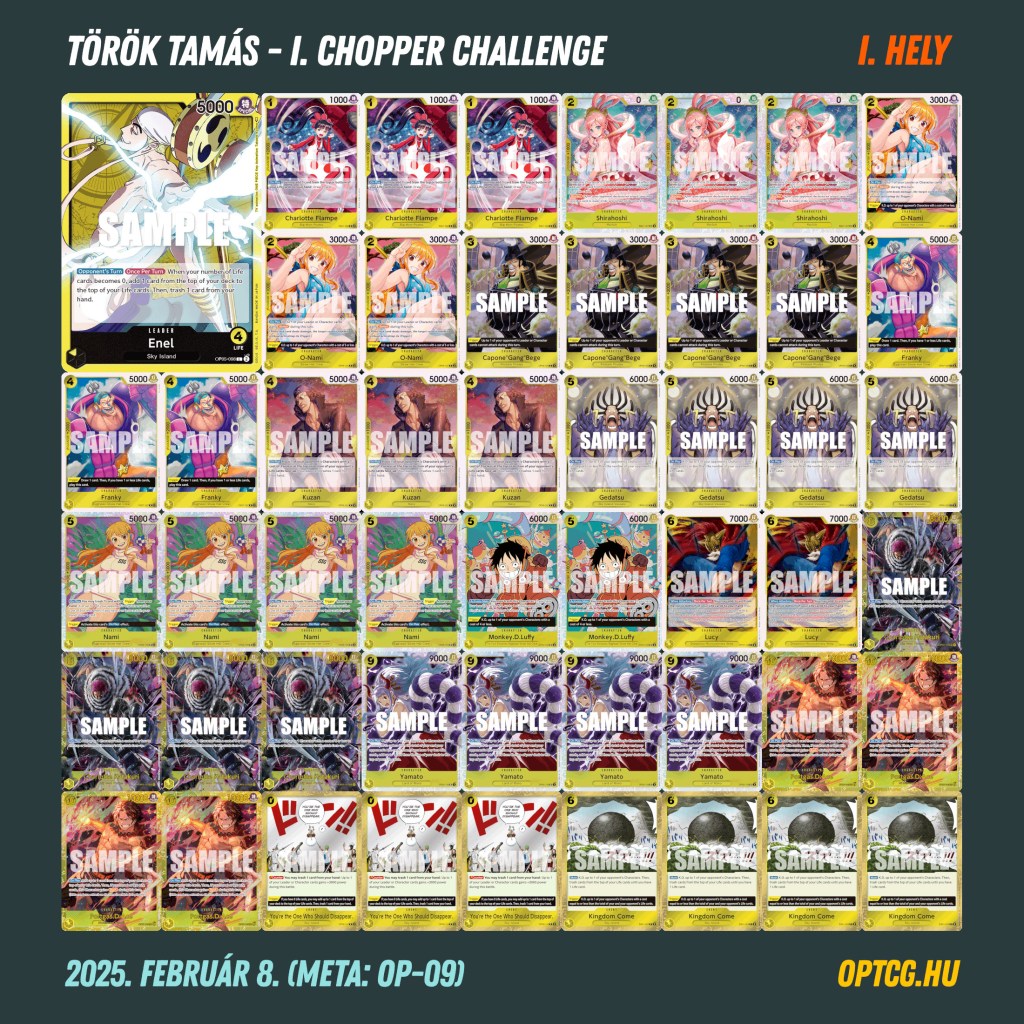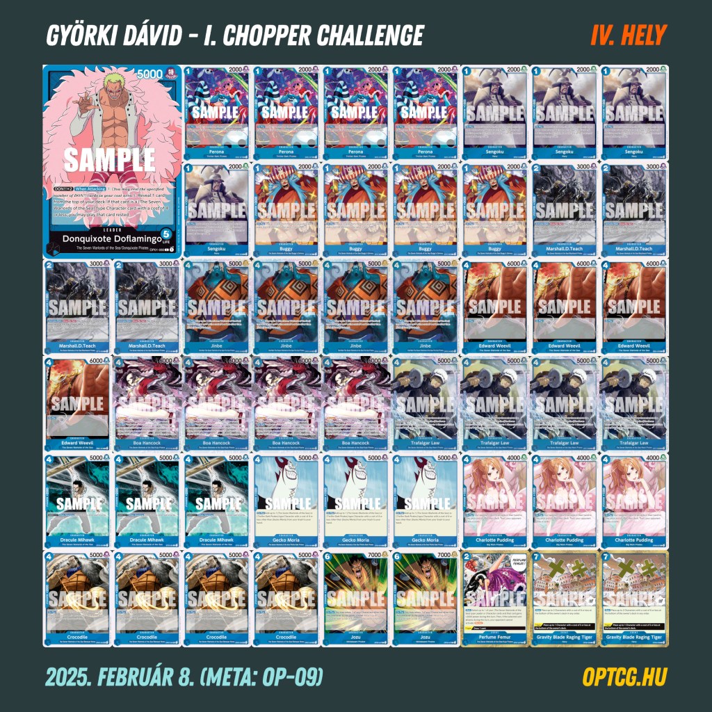 A One Piece Card Game kis hazánkban is óriási növekedésen ment keresztül az elmúlt két évben, amit jól mutatnak a rendre kimagasló létszámmal zajló kiemelt események, emiatt pedig úgy gondoltuk, érdemes lenne jobban bevonni a kezdőket is ebbe a szuper versenyközegbe. Így született meg a Chopper Challenge ötlete, ami egy olyan versenysorozat, ahol nem indulhatnak azok, akik értek már el top cut eredményt Nemzeti Bajnokságon vagy Alanor által szervezett kupán.