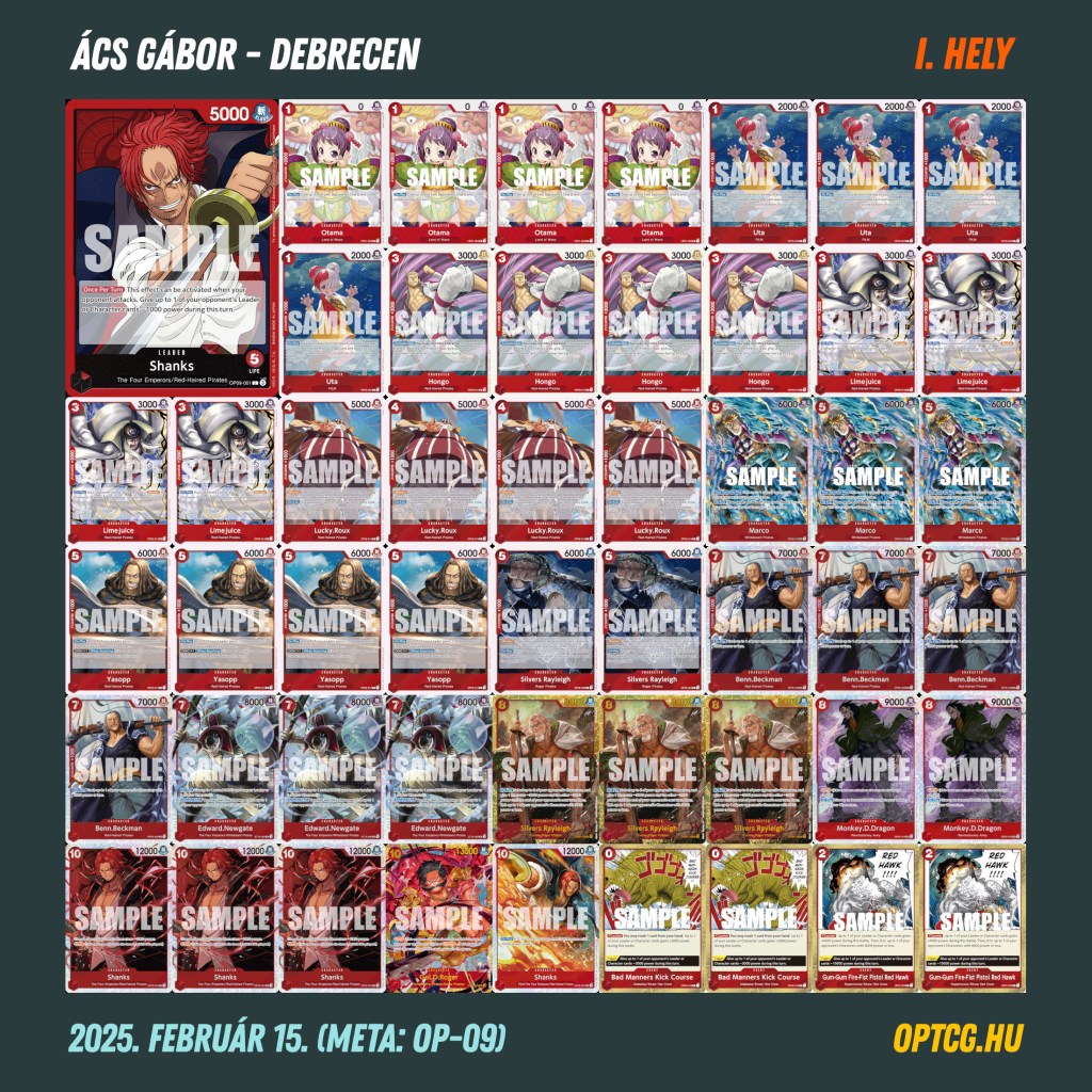 A pirossal játszó deckek végül erős napot zártak, hiszen mindhárom ilyen pakli odaért a dobogóra. Az első helyen Ács Gábor végzett a jelenlegi meta első számú Red koncepciójával, Shanksszel, a második Bojtor Gábor lett a mostanság új erőre kapó RP Luffyval, a harmadik helyre pedig Paranai Ádám ért oda, méghozzá az egykoron egyeduralkodó, manapság viszont nem igazán játszott Newgate-tel hozva egy meglepetéseredményt.