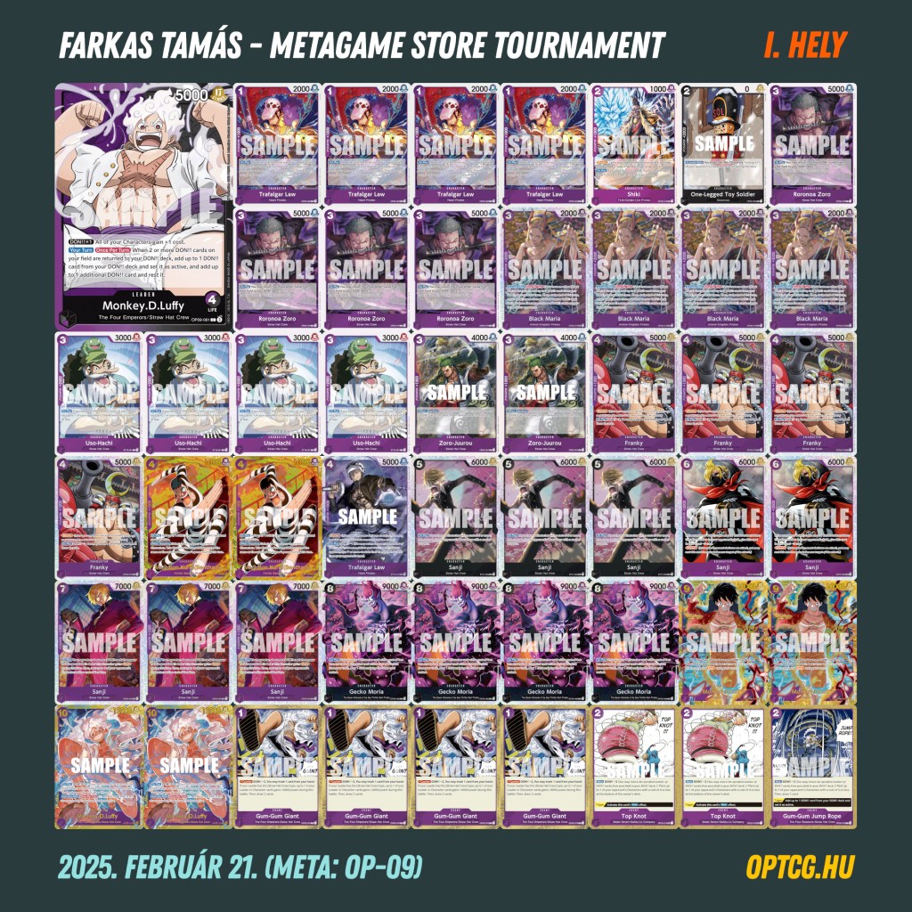 A létszámból adódóan három forduló pontosan elegendő volt ahhoz, hogy kialakuljon a végeredémny, a győzelmet pedig végül Farkas Tamás szerezte meg, aki egy BP Luffy deckkel ért oda az első helyre – az ő paklilistáját lent láthatjátok. 2-1-es mérleggel Kutrovics Kornél, Mikulás Ádám és Török Tamás végeztek.