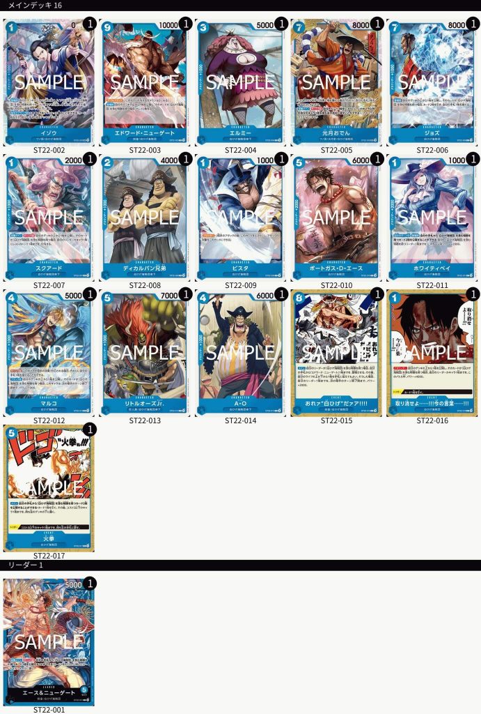 A csomag egy új kék Leadert, mellé pedig csupa vadonatúj lapot fog tartalmazni, melyekből AA-verziók is bonthatóak lesznek – az ST-10, az ST-13 és az ST-21 után tehát ez is “nagy” Starter Deck lesz. Íme a laplista, illetve a fordítások.