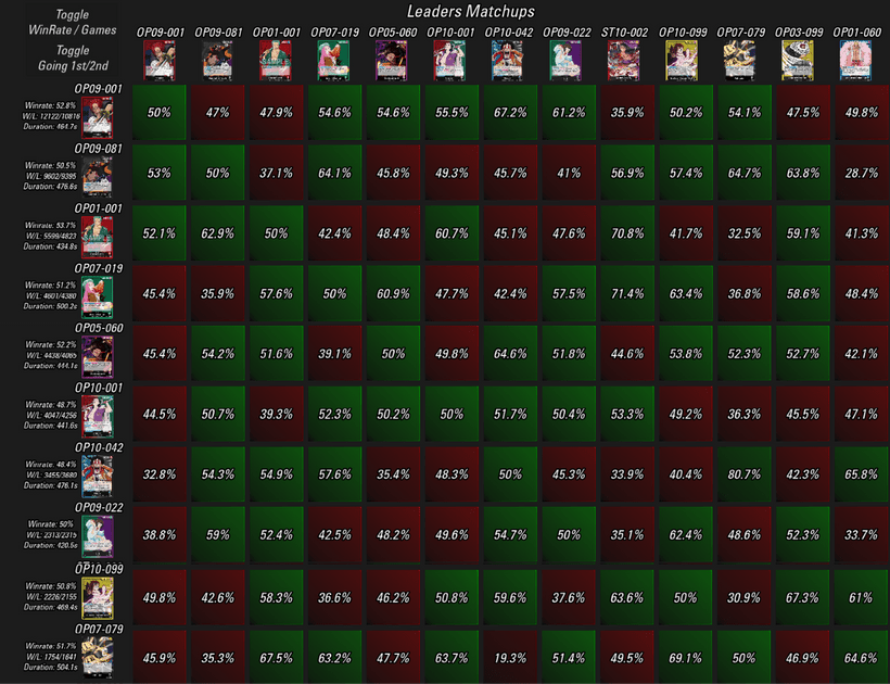 A TCG Match Making közzétette legfrissebb kivonatát a One Piece Card Game aktuális metájára vonatkozóan, melynek alapját az OPTCGSim ranked módja, az OPBounty adja. Rovatunkban mi is kizárólag a publikusan elérhető információkra hagyatkozunk – aki még részletesebb statisztikákra kíváncsi, az támogassa őket a Patreonon, és hozzáférést kap a teljes adattáblához.