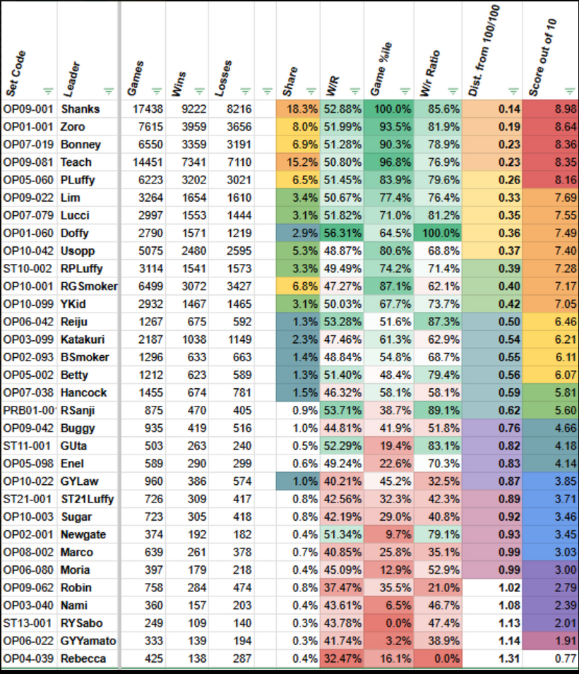 A heti kimutatásokban ezidáig kizárólag a tíz legnépszerűbb Leadert láthattuk, most azonban mélyebb betekintést nyerhetnek a metába azok is, akiknek nincs előfizetésük. Az élmezőnyben nem történt változás: továbbra is Shanks, Zoro, Bonney, Teach, Pluffy a sorrend Tier 1-ben, maguk a deckek azonban közelebb kerültek egymáshoz. Mögöttük hét deck alkotja az üldözőbolyt Limmel, Luccival, Doffyval, Usoppal, az RP Luffyval, az RG Smokerrel és a sárga Kiddel.