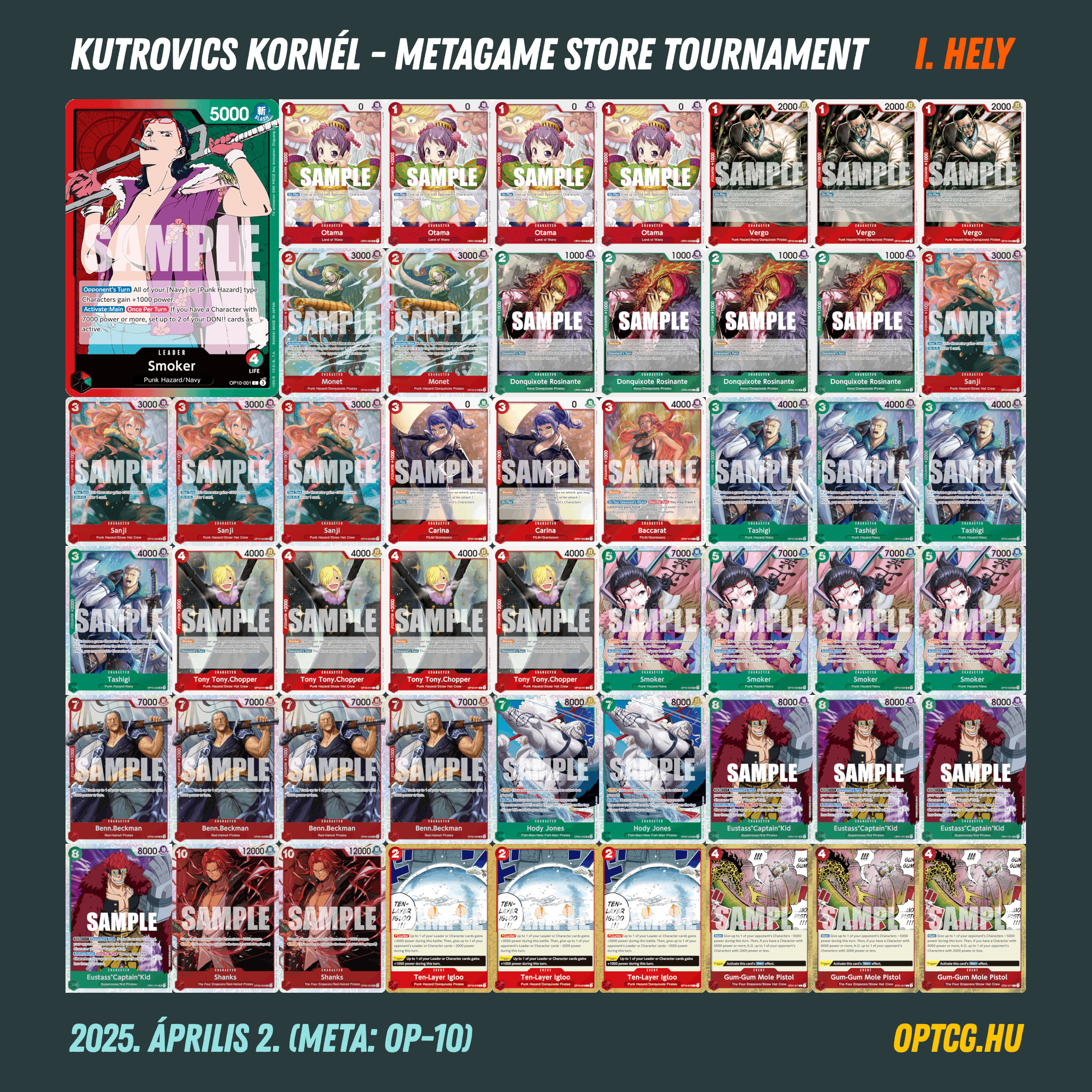 A nagy létszám ellenére öt forduló is elegendő volt ahhoz, hogy kialakuljon a végső sorrend, a győzelmet pedig az OP-10 egyik csúcsragadozója, a piros-zöld Smoker szerezte meg Kutrovics Kornél révén. A korai zárás miatt sokan végeztek négy győzelemmel: két-két Shanks, lila Luffy és piros-lila Luffy mellett egy-egy Belo Betty, Bonney és Teach ért oda az élmezőnybe. Összességében tehát kijelenthetjük, hogy nagyon sikeres napot zárt a piros szín, ami mostanában ritkán volt jellemző.