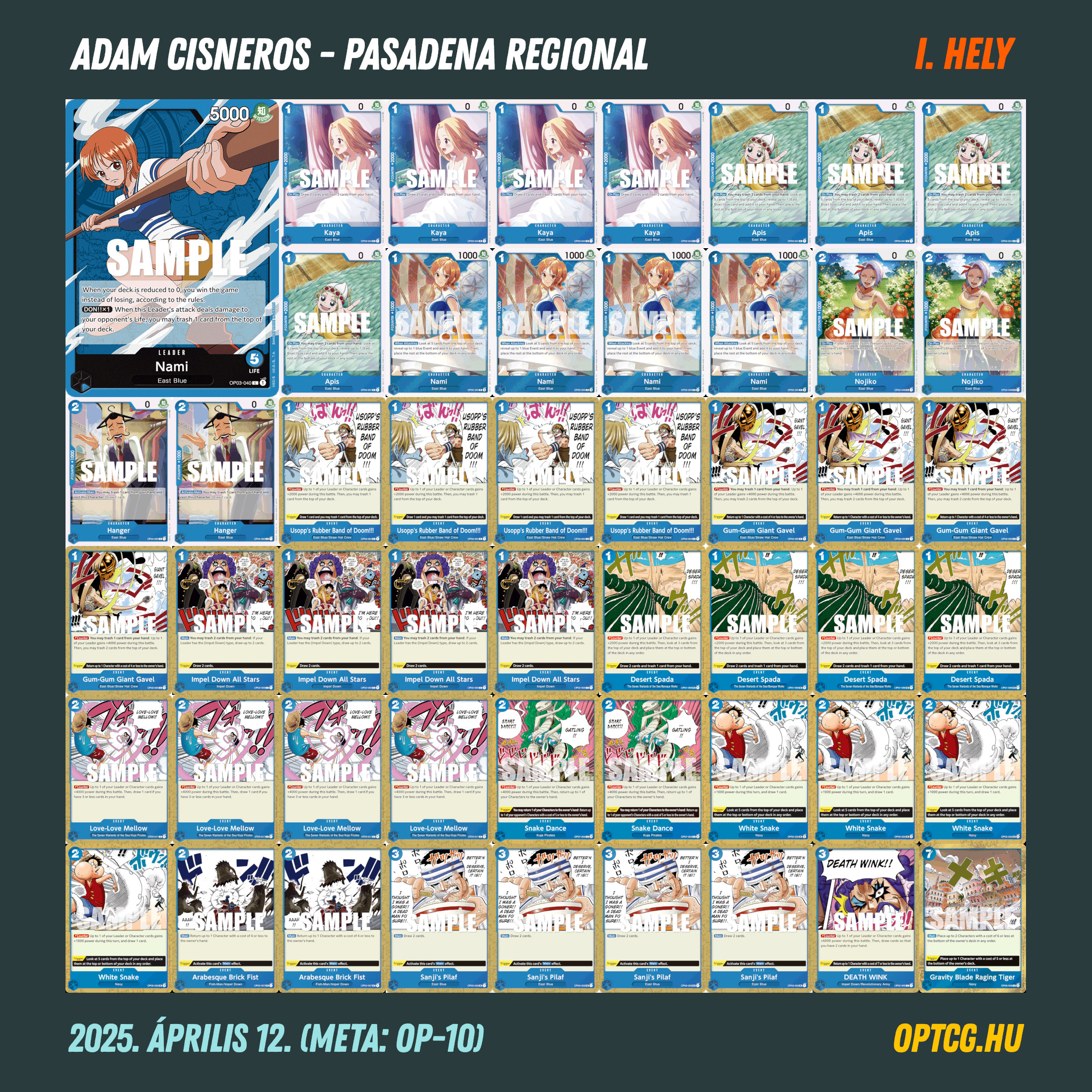 Hiába a sok lila Luffy, Shanks és Teach, végül itt is meglepetésgyőzelem született, az első helyre ugyanis – első napi 9:0 után – Adam “UnlikelyHero” Cisneros ért oda, méghozzá Namival, amit sokan nem éreztek elég jónak a mostani formátumra, most azonban megmutatta, hogy van még benne potenciál, kellő szerencsével persze.
