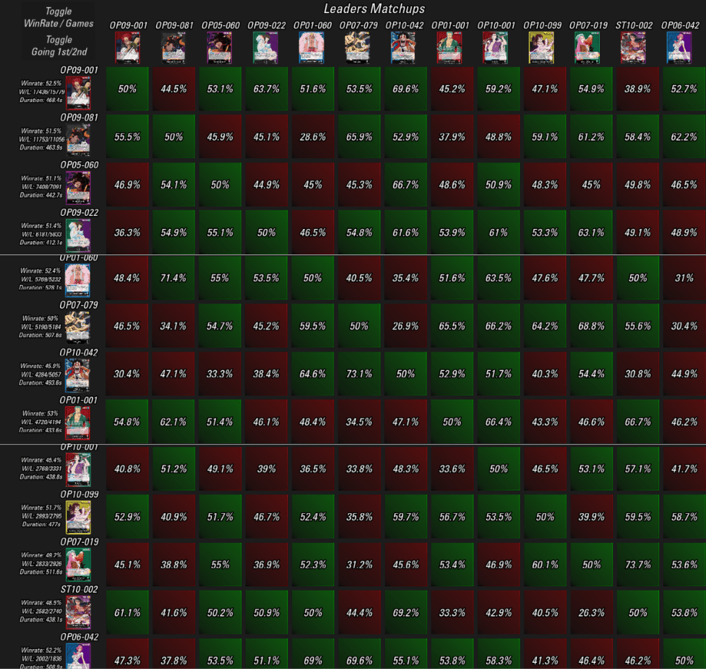 Hogy mennyire szoros a meta, az a winrate adatokon látszik igazán, még kisebb ugyanis a távolság ilyen tekintetben az élmezőny szereplői között. A jelentősen eltérő használati arányok miatt ezek az adatok persze torzítanak valamelyest, de épp ez mutatja jól, hogy miért állt újból az élre Shanks, brutálisan magas meccsszámmal is odaért ugyanis a második helyre, a másik piros deck, Zoro mögé. Reiju kisebb meglepetésre negyedik, igaz, a minta itt igencsak kicsi, Lim meccsei ellenben megduplázódtak a sikerekre reagálva – így is képes volt tartani ugyanakkor az erős számokat.