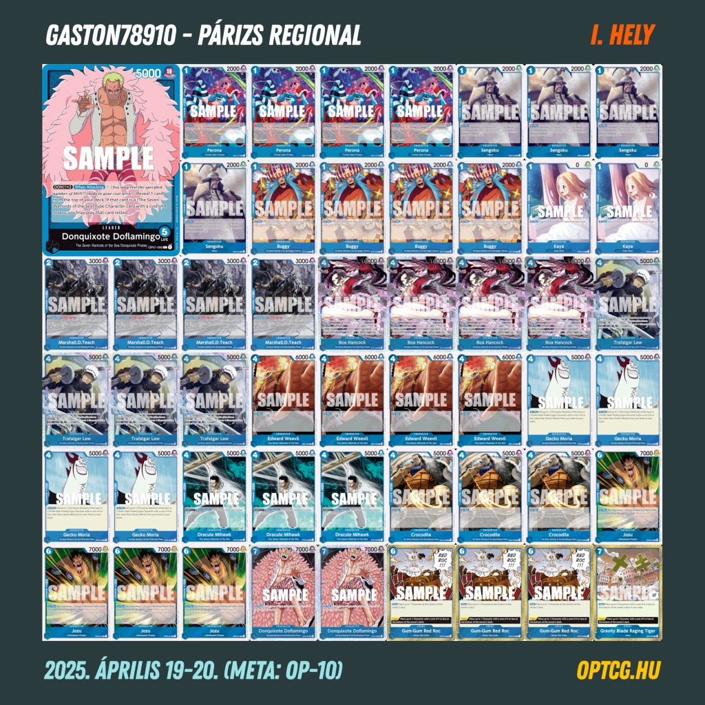 Végül a döntőt is egy Shanks és egy lila Luffy vívta, a győzelmet viszont nem az előbbi szerezte meg, Gerardo Lopez Pluffyja diadalmaskodott ugyanis a fináléban Quan Le igencsak agresszívra hangolt piros összeállítását feltartóztatva. A paklilistákat lent láthatjátok: