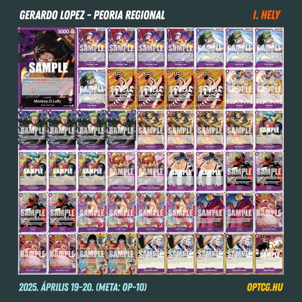 Az illinoisi Peoria nem először adott otthon regionális versenynek, ahol olyan szempontból a megszokott meta várta a résztvevőeket, hogy a mezőny egyötödét a Shanks deckek tették ki, és ugyanennyi volt összesítve a Teach-ből plusz a lila Luffyból. De igencsak szorosan felzárkózott utóbbi kettőhöz a kék Doffy is, emellett pedig meglepően sok sárga Kid volt az indulók között, és az új sztár, Lim is szépen feljött az üldözőkhöz.