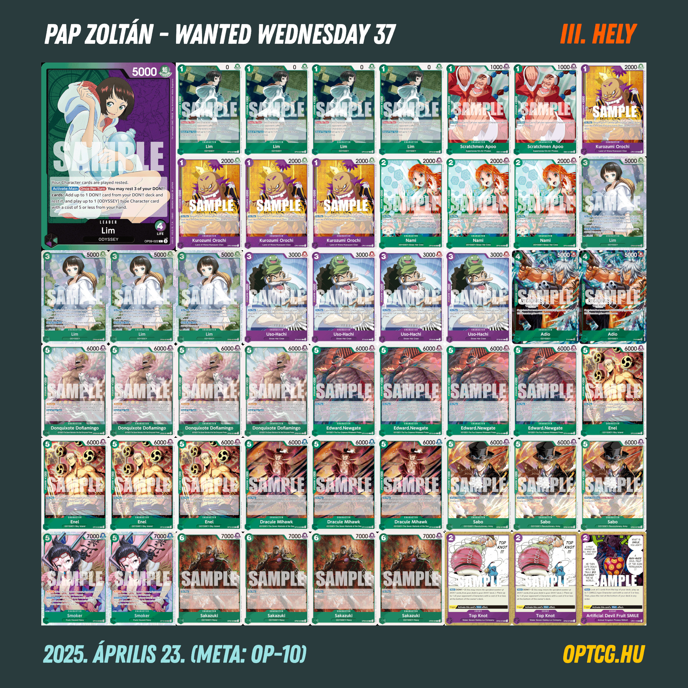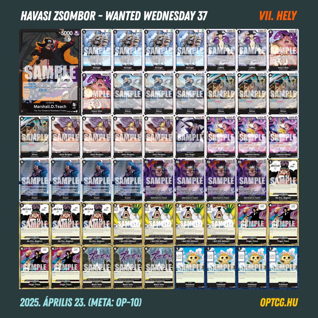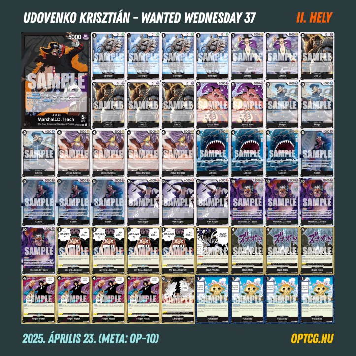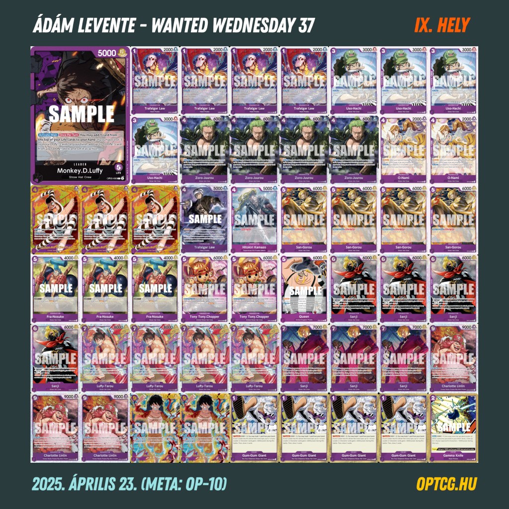 Ha szerda, akkor One Piece lokál a Meta Klubban, amely ezúttal a Wanted Wednesday versenysorozat 37. felvonását hozta, ahol most az OP-01-es piros-zöld Trafalgar Law volt a Wanted Leader, mellyel hárman is bepróbálkoztak az este folyamán. A létszám szokás szerint magas volt: összesen 44-en vettek részt a versenyen, méghozzá az alábbi koncepciókkal.