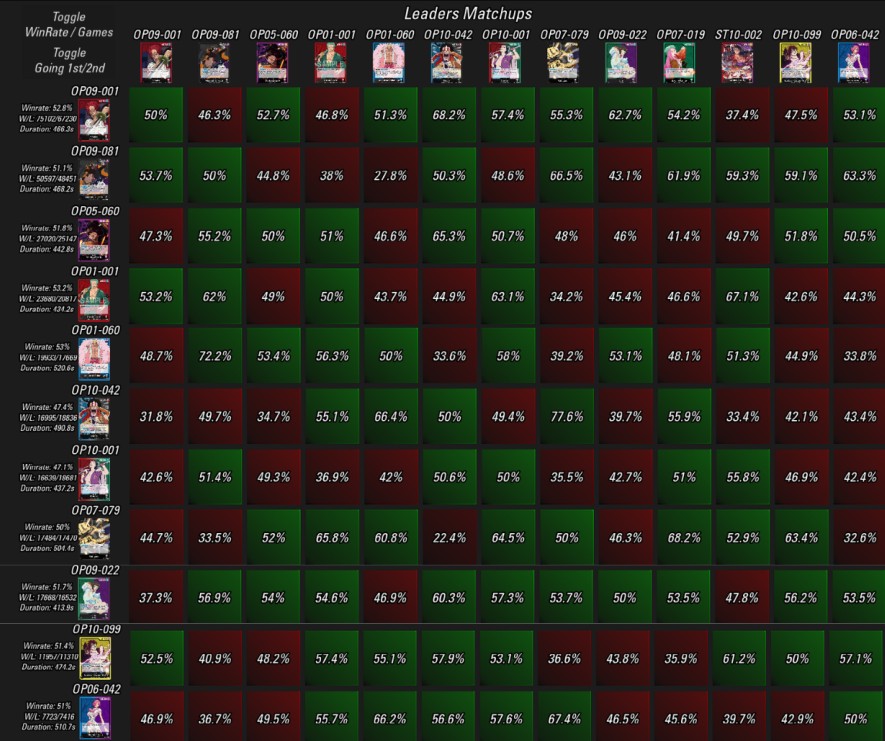 A TCG Match Making közzétette legfrissebb kivonatát a One Piece Card Game aktuális metájára vonatkozóan, melynek alapját az OPTCGSim ranked módja, az OPBounty adja. Rovatunkban mi is kizárólag a publikusan elérhető információkra hagyatkozunk – aki még részletesebb statisztikákra kíváncsi, az támogassa őket a Patreonon, és hozzáférést kap a teljes adattáblához.