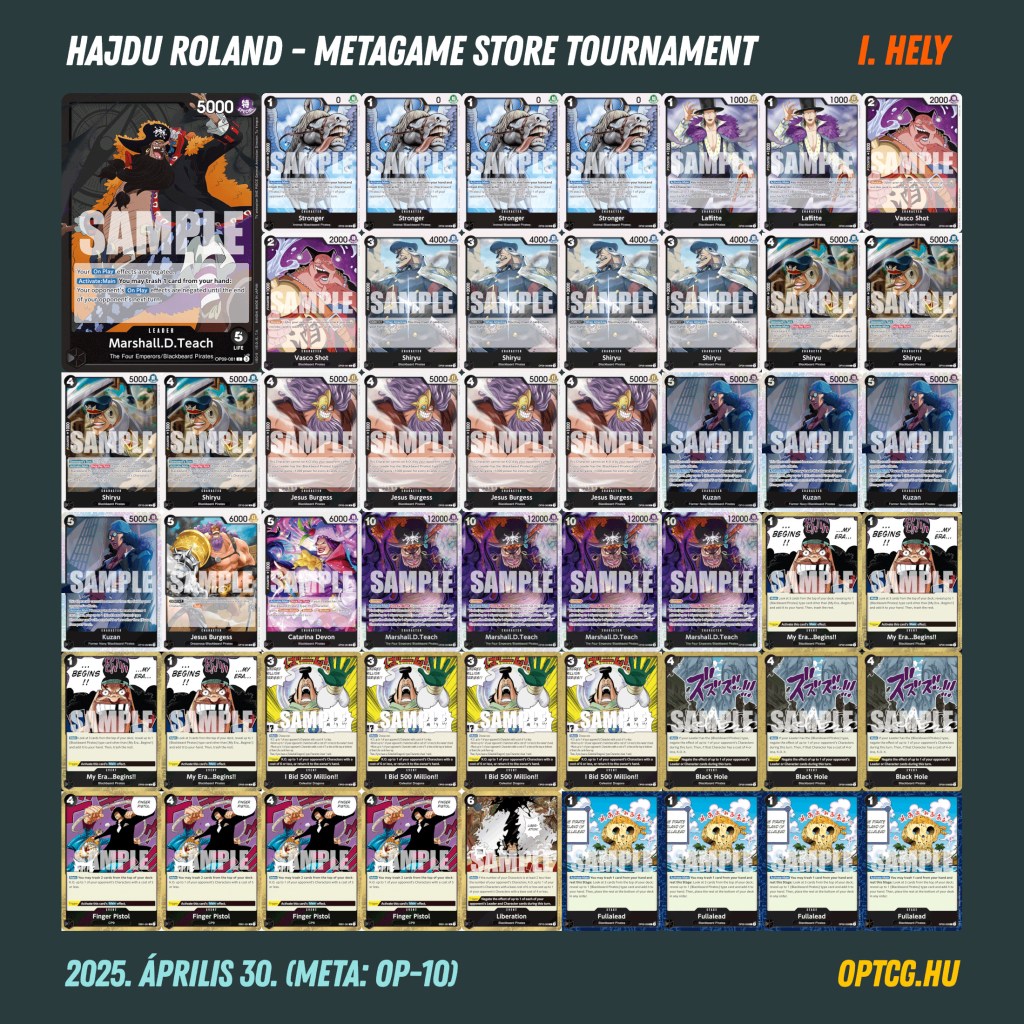 A döntőt végül egy Teach és egy sárga Kid vívta, a győzelmet pedig szoros csatában Hajdu Roland szerezte meg, így újabb strigulát húzott be az itthon is igen sikeres BB. A hat forduló miatt ezúttal csupán négyen zártak 5-1-es mérleggel – az Usopp deckek közül végül kettő is itt zárt, illetve egy Shanks is befért az élmezőnybe.
