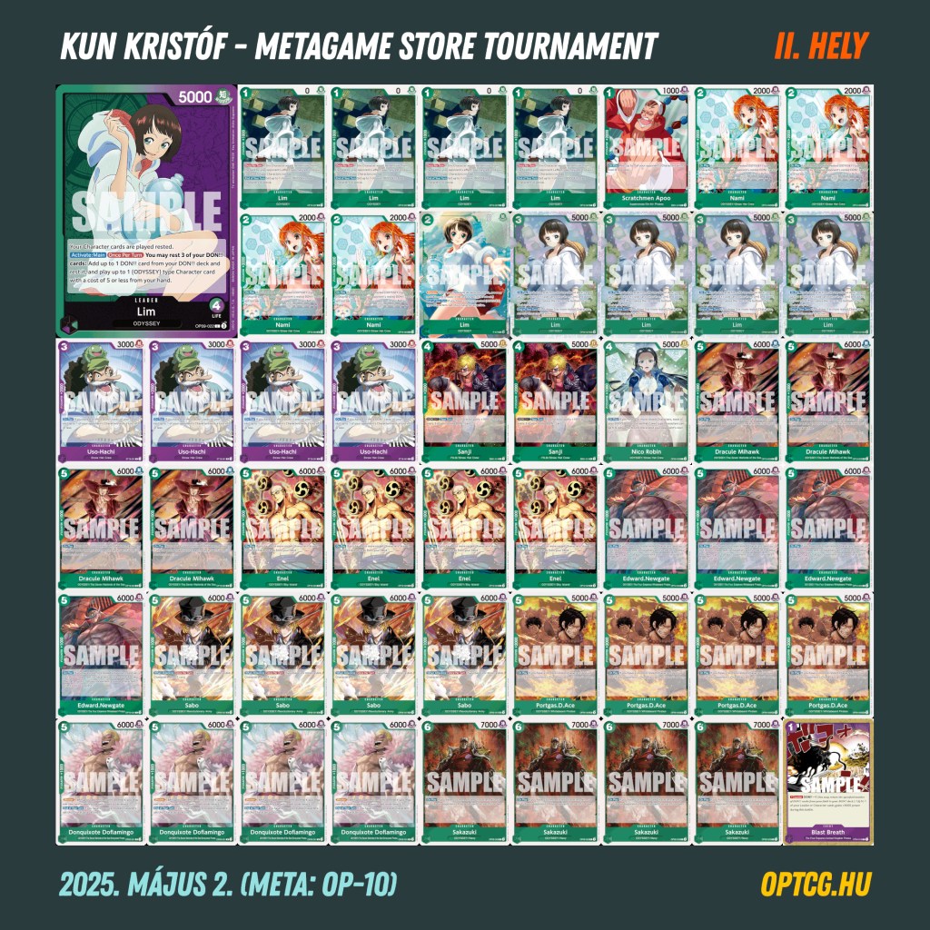 A verseny végül 5 fordulós volt, a döntőben pedig Ádám Levente és Kun Kristóf csaptak össze, ahol előbbi játékos szerezte meg a győzelmet, így Teach ezen a héten duplázni tudott a Metagame versenyein. A 4-1-es helyekre egy Lim, két Usopp és egy Shanks ért oda.