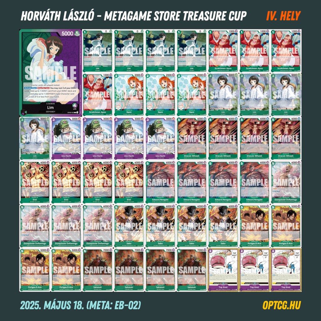 Szerda és péntek után vasárnap is One Piece-verseny volt a Meta Klubban, ezúttal ráadásul nem sima lokál, a Store Treasure Cupon ugyanis extra nyeremények (Event Pack Vol. 6 az indulóknak, illetve új promó Pudding a győztesnek) vártak a játékosokra. Összesen 29-en indultak, méghozzá az alábbi Leaderekkel.