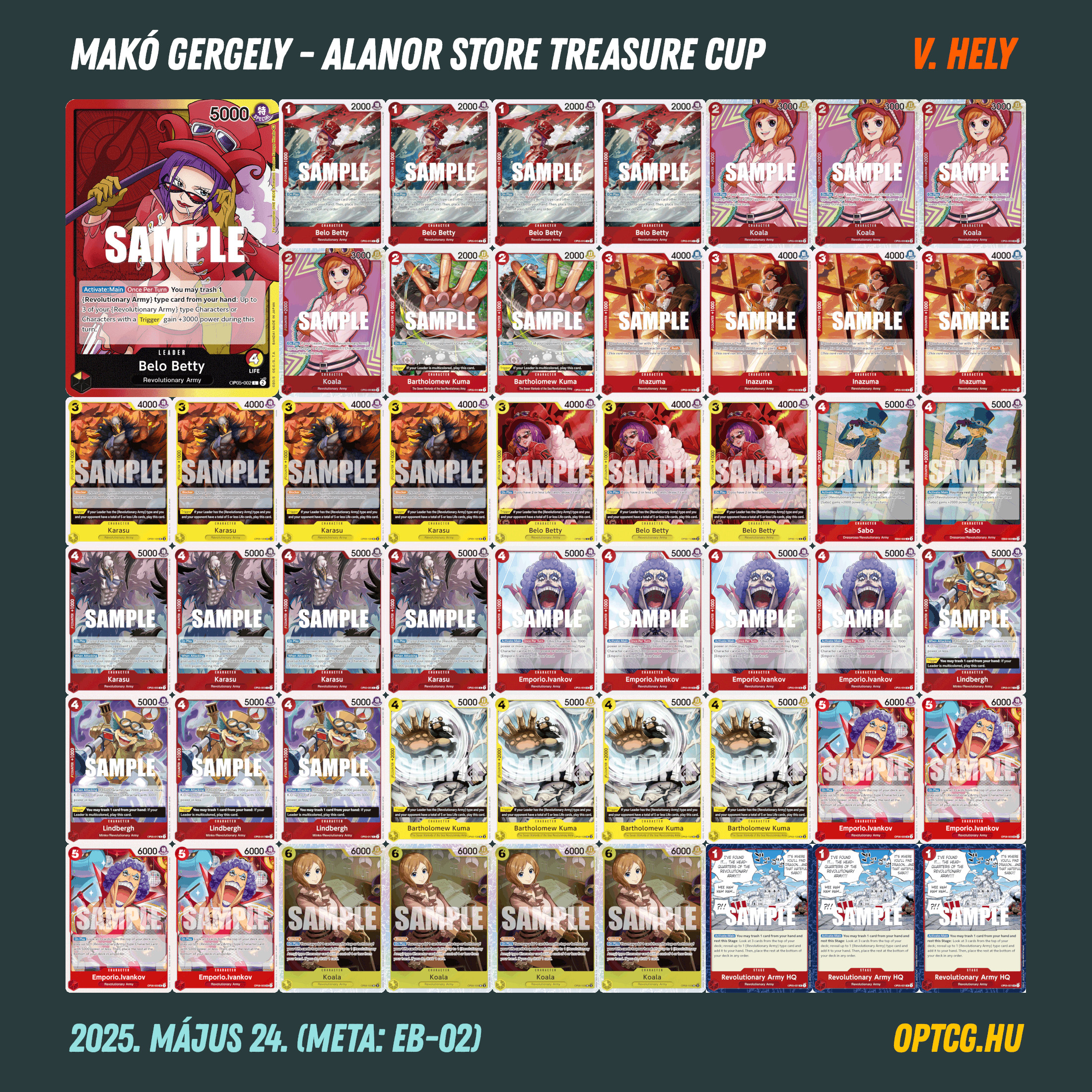 A döntőben a jelenlegi meta két talán legerősebb deckje (legalábbis a statisztikák alapján) csapott össze, Ádám Levente (GP Luffy) és Udovenko Krisztián (Teach) párharcából pedig előbbi került ki győztesen, megszerezve ezzel a pakli első hazai sikerét. A 4-1-es helyekre egy másik “szőlő” Luffy is odaért, valamint egy-egy Lim és Belo Betty befért az élmezőnybe.