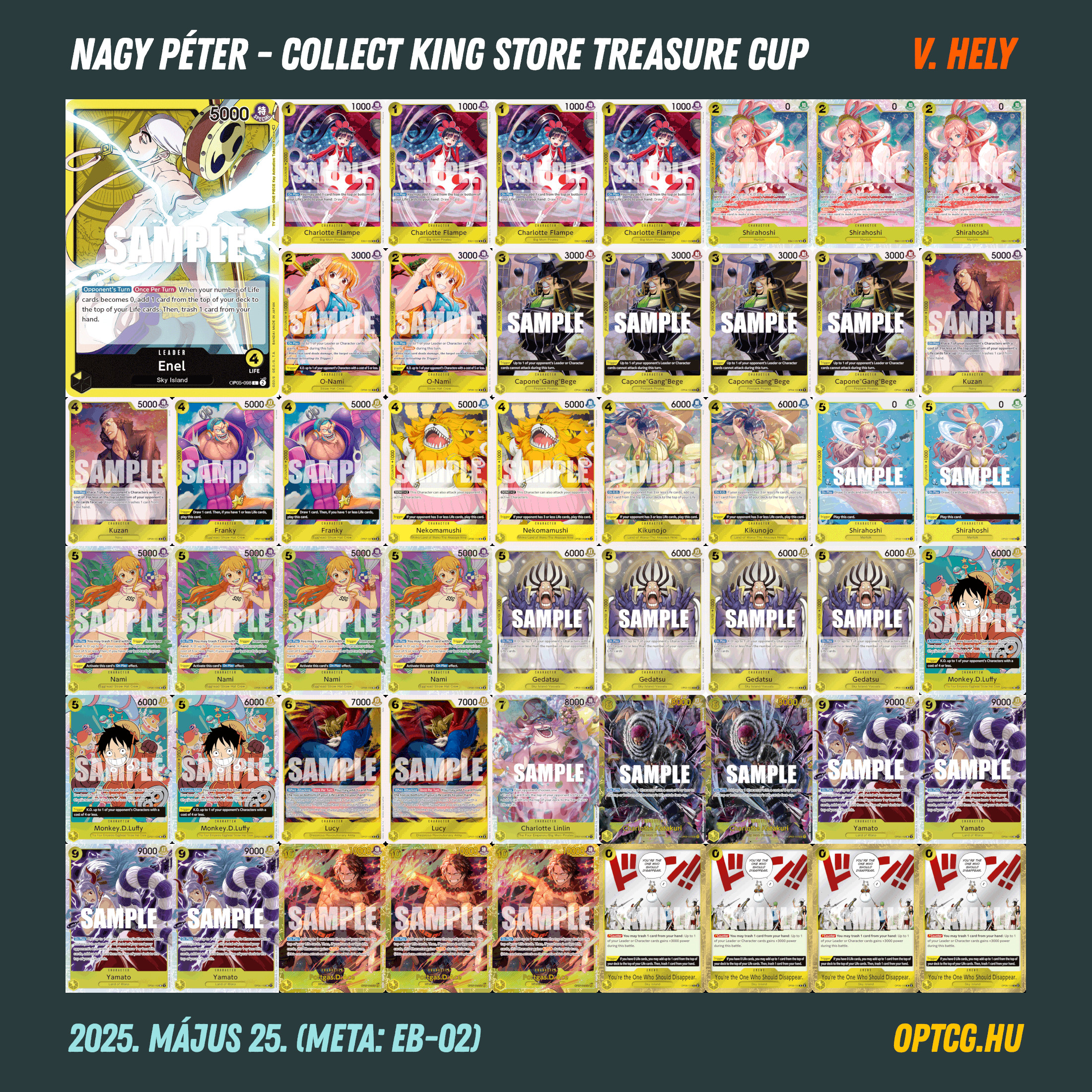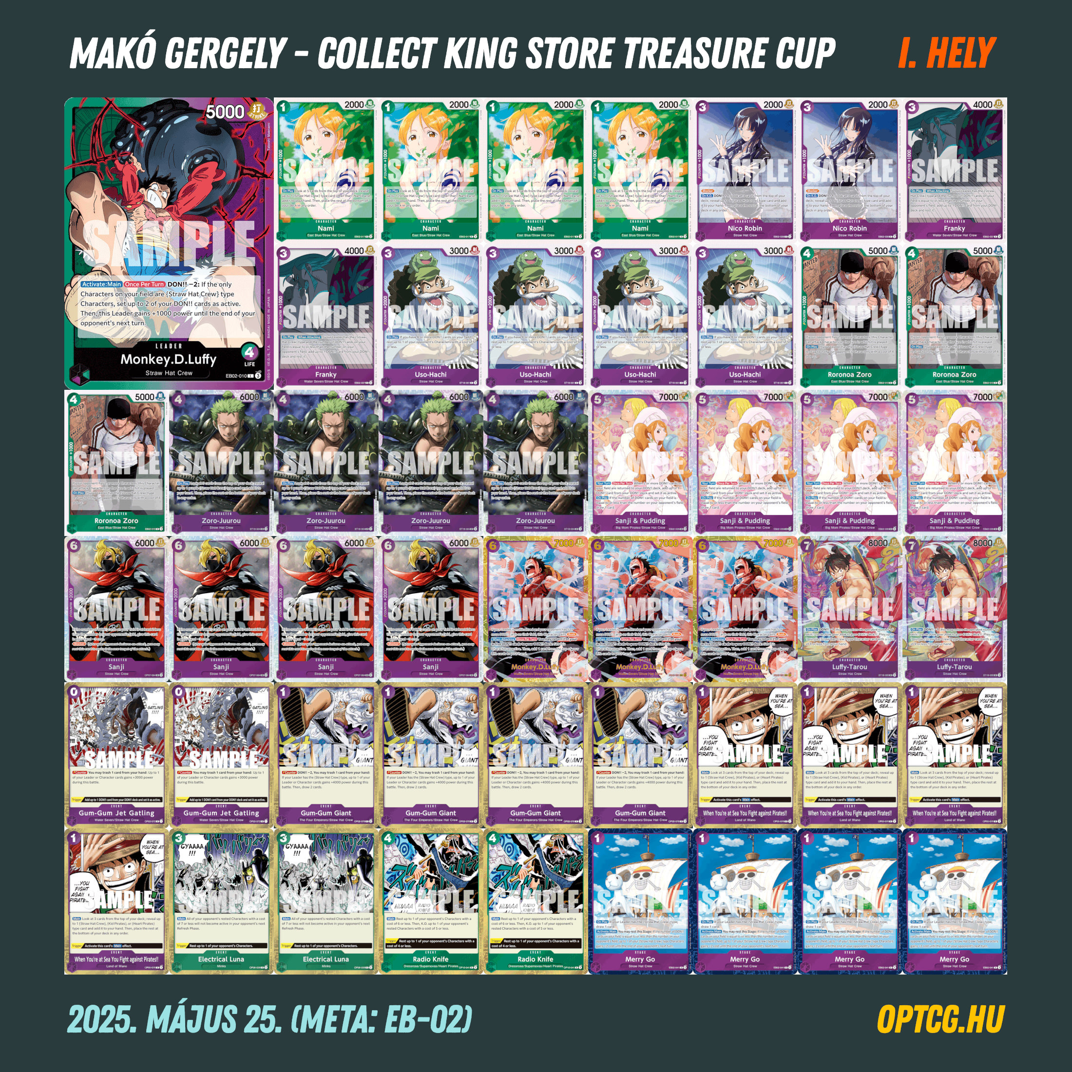 Azok után, hogy szombaton megszerezte első hazai győzelmét a meta legújabb csúcsragadozója, az EB-02-ben megjelent zöld-lila Monkey.D.Luffy, vasárnap ismét ez a koncepció diadalmaskodott, méghozzá Makó Gergely révén. Sőt, olyan történt ezúttal, ami a hazai OP történetében talán még egyszer sem, a “szőlős” Luffy ugyanis a komplett dobogót kisajátította, miután Sánta Botond és Farkas Tamás is ezzel a deckkel értek oda a második és a harmadik helyre.