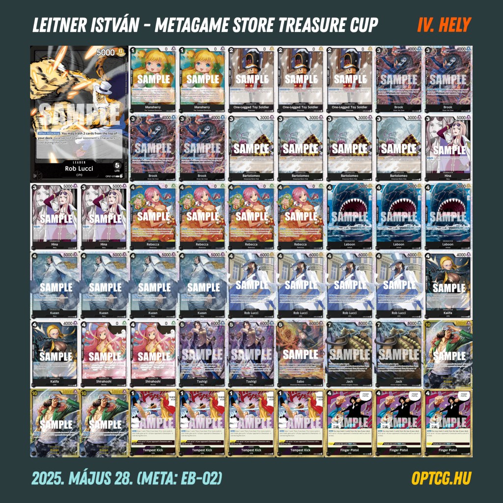 Az EB-02 új csúcsragadozója, a zöld-lila Luffy magasan a legnépszerűbb deck volt, heten is ezt választották, rajta kívül ugyanakkor csupán Shanks volt az, akit kettőnél több játékos hozott. Emiatt összességében változatos volt a mezőny, 22 különböző Leaderrel.