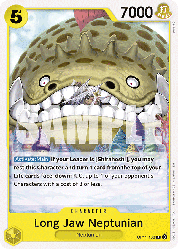 Az önmagában szuper, ha 1-ért ki tudunk rakni egy közepes testet, de maradék DON!!-nal is kellene valamit kezdeni – pláne úgy, hogy a Leaderre hiába csatoljuk. Erre a célra hibátlan Megalo, aki ütni ritkán fog, viszont 3-ért 6000-es blocker, akit akár a Leaderrel is ki tudunk tenni, ha nincs jobb. Shirahoshi pedig a laputánpótlást biztosítja – cápapajtásával ráadásul rögtön jó kombót alkot, egy sima 5000-es ütés ugyanis nem tudja így elvinni, vagyis akár többször is dolgozhat (vagy az ellenfélnek be kell vállalnia a korai tempóhátrányt).