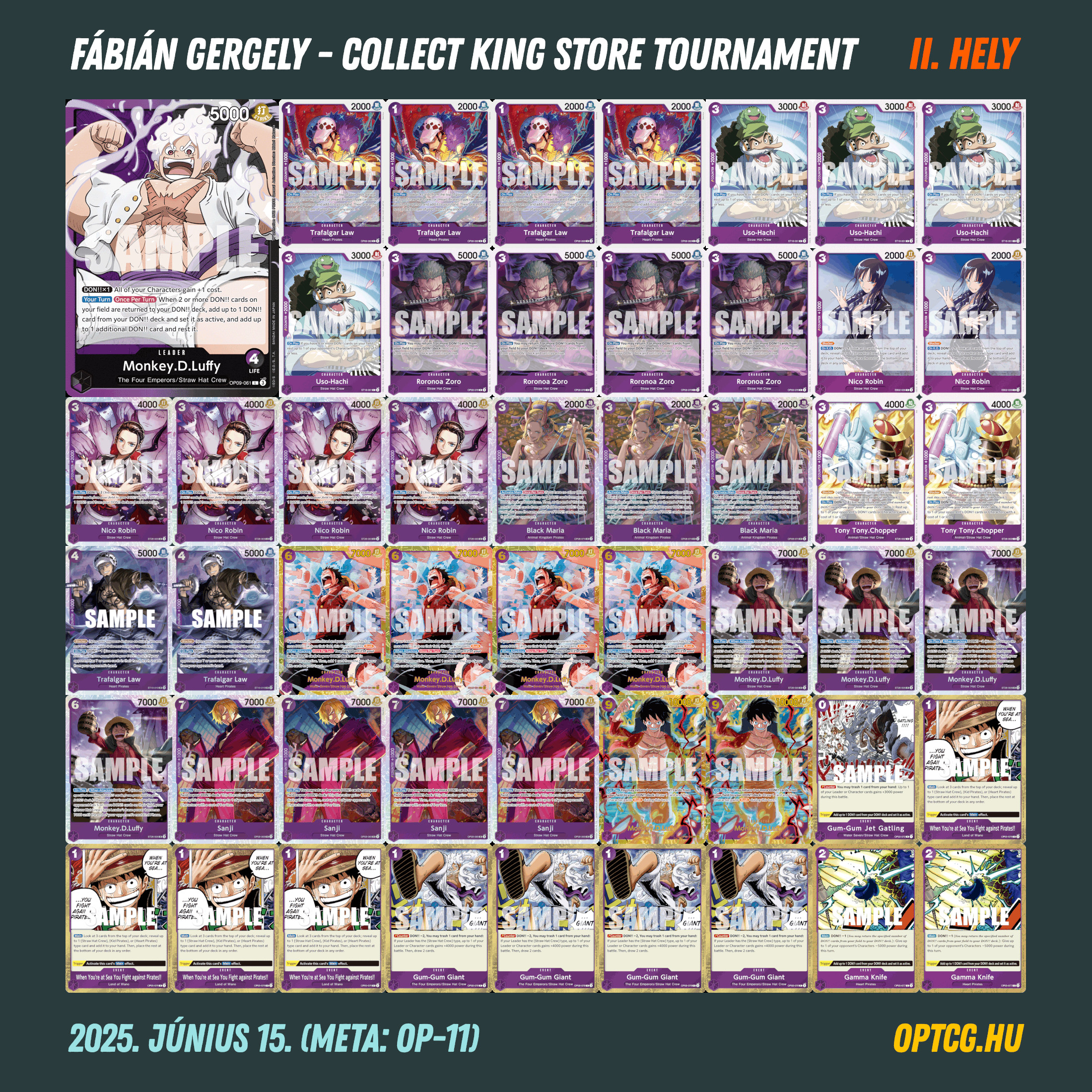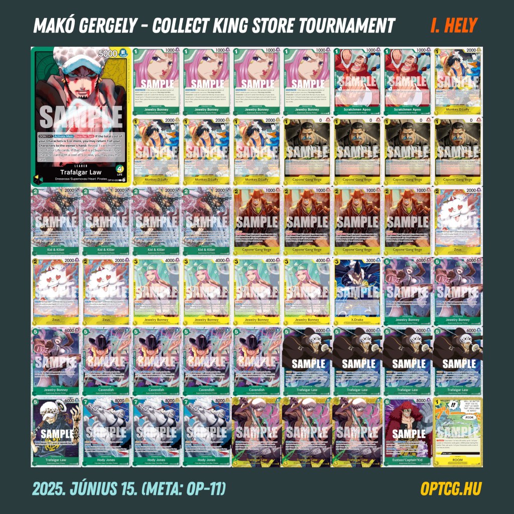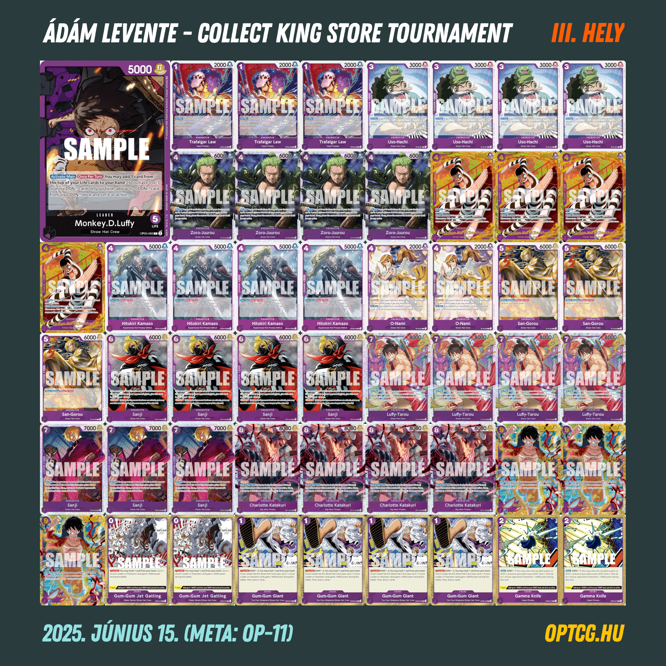 Családias légkörben, 9 fő részvételével zajlott a Manytime-ban a Collect King legutóbbi versenye, ahol folytatódott az OP-11 és az új Starter Deckek által jelentett mélyvíz. Kísérletezésben nem volt hiány, mindössze két játékos hozott ugyanolyan paklit – az eddig brutálisan népszerű UP Luffyt ezúttal meglepő mód mindenki otthon hagyta.