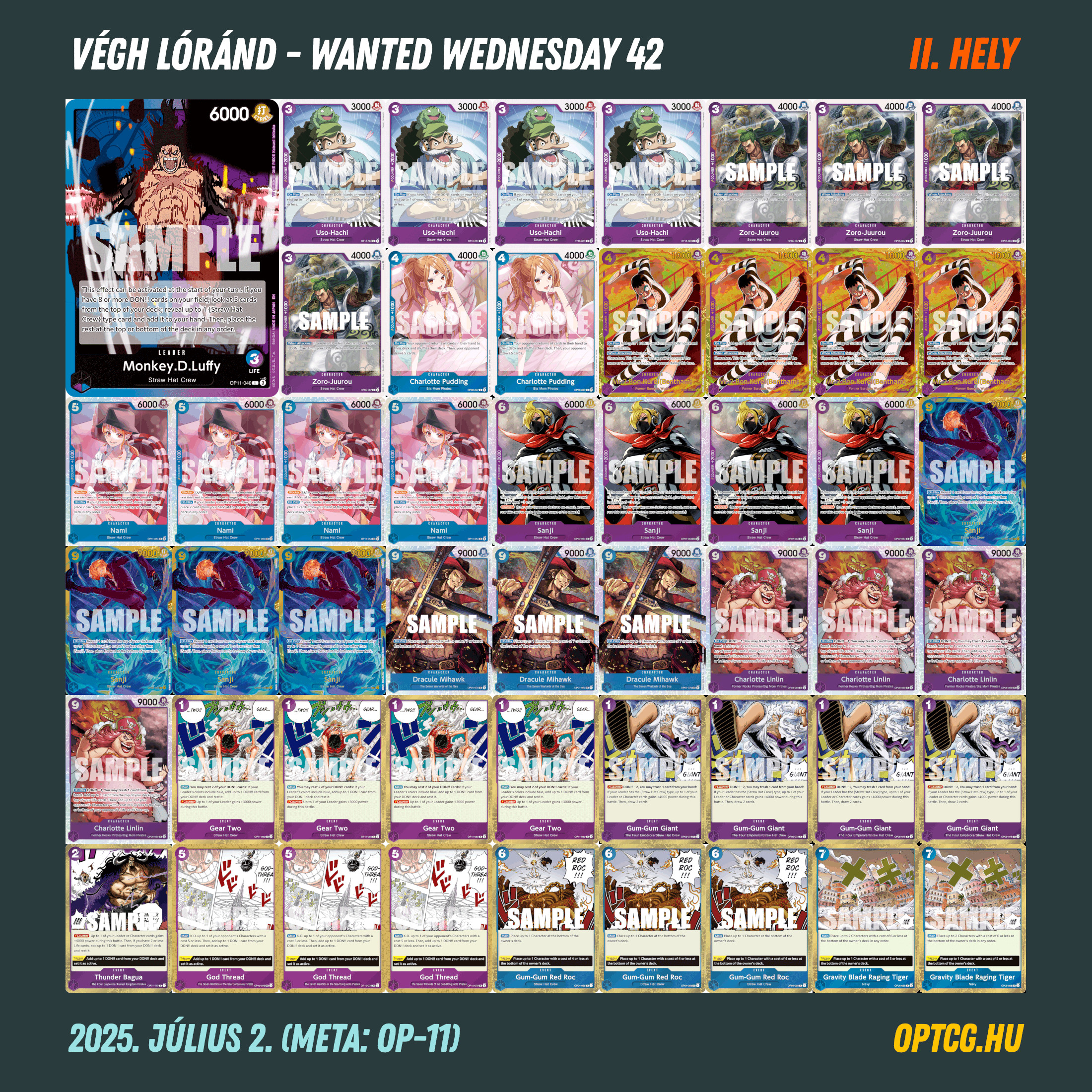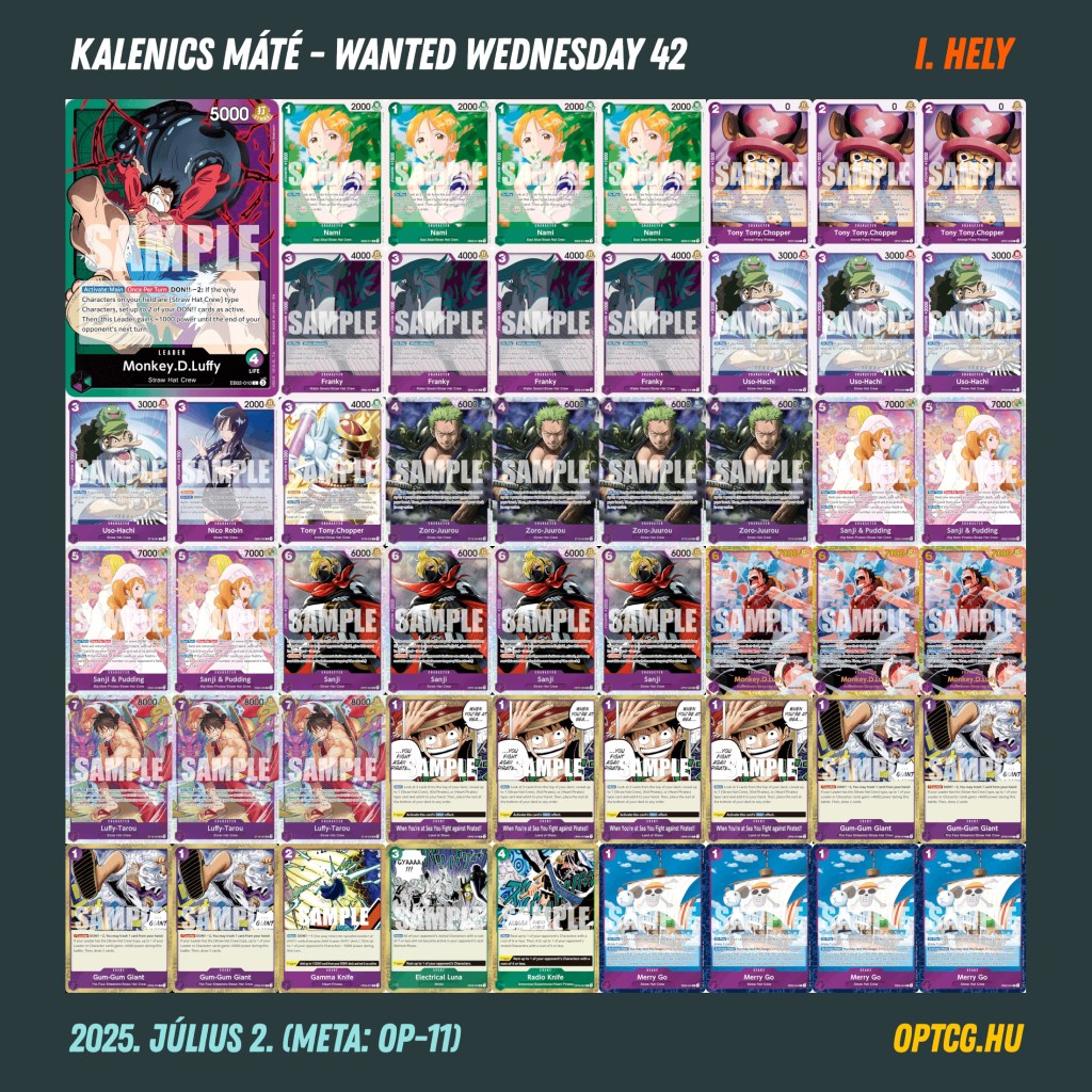 Bár több ponton is elég lehetett volna az öt forduló, végül hat kört kellett játszania a mezőnynek, a mindent eldöntő meccsen pedig Kalenics Máté és Végh Lóránd csaptak össze a jelenlegi meta klasszikusának mondható GP Luffy vs. UP Luffy rangadó keretein belül – a mérkőzést végül előbbi nyerte, így exigo újabb WW-győzelmet könyvelhetett el. 5-1-es mérleggel ezúttal csak hárman zártak: Lóri mellett Ádám Levente és Köteles Dániel értek oda az élmezőnybe lila Luffyval, illetve Rob Luccival, így teljes lett a Luffy-dobogó, illetve a mostanság kevésbé remeklő fekete szín is kicsit feltámadt. A legjobb Wanted Leader-játékos Gavló Dániel lett, aki 4-2-es eredményével a Top 10-be is befért a kék-sárga Namival.