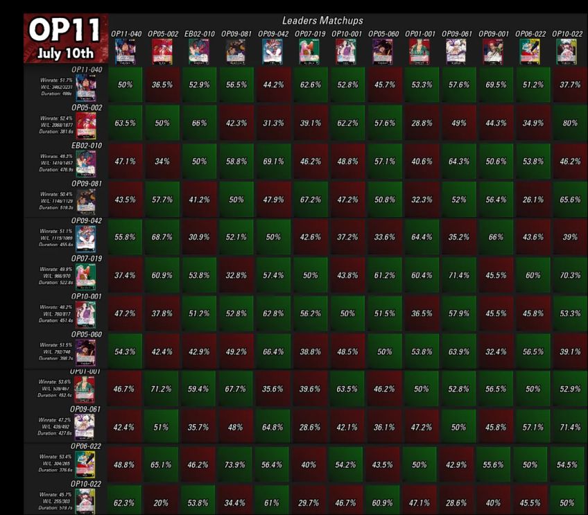 A győzelmi arányok a teljes mezőnyt tekintve visszafogottabbak ezúttal (illetve az adatok alapjául szolgáló meccsszám is kevesebb), az UP Luffy erejét pedig jól mutatja, hogy a legnépszerűbb deckként is képes volt tovább javulni néhány tized százalékpontot. A korábbi első Belo Betty visszacsúszott a harmadik helyre, Zoro és – kisebb meglepetésre – Yamato is átugrotta, de itt nagyon alacsonyak a meccsszámok (főleg a zöld-sárga Leader esetében), így ezeket a számokat érdemes helyükön kezelni.
