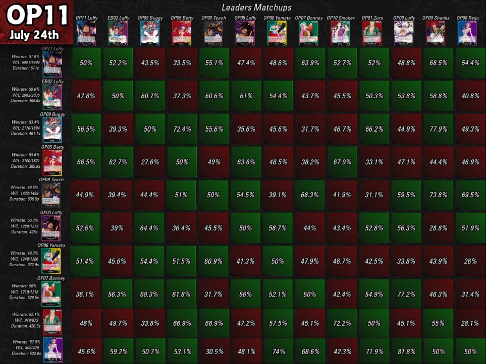 A jelenlegi meta utolsó heteibe lépve most már mindenki azt figyeli, hogy képes lesz-e bármelyik Leader letaszítani a trónról az UP Luffyt, legalábbis ami a ranked adatokat illeti. Erre mutatkozott is némi esély, az előző hét tendenciája azonban nem folytatódott – viszont ez nem jelenti azt, hogy nincsenek említésre méltó fejlemények…