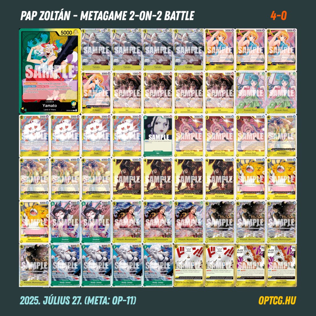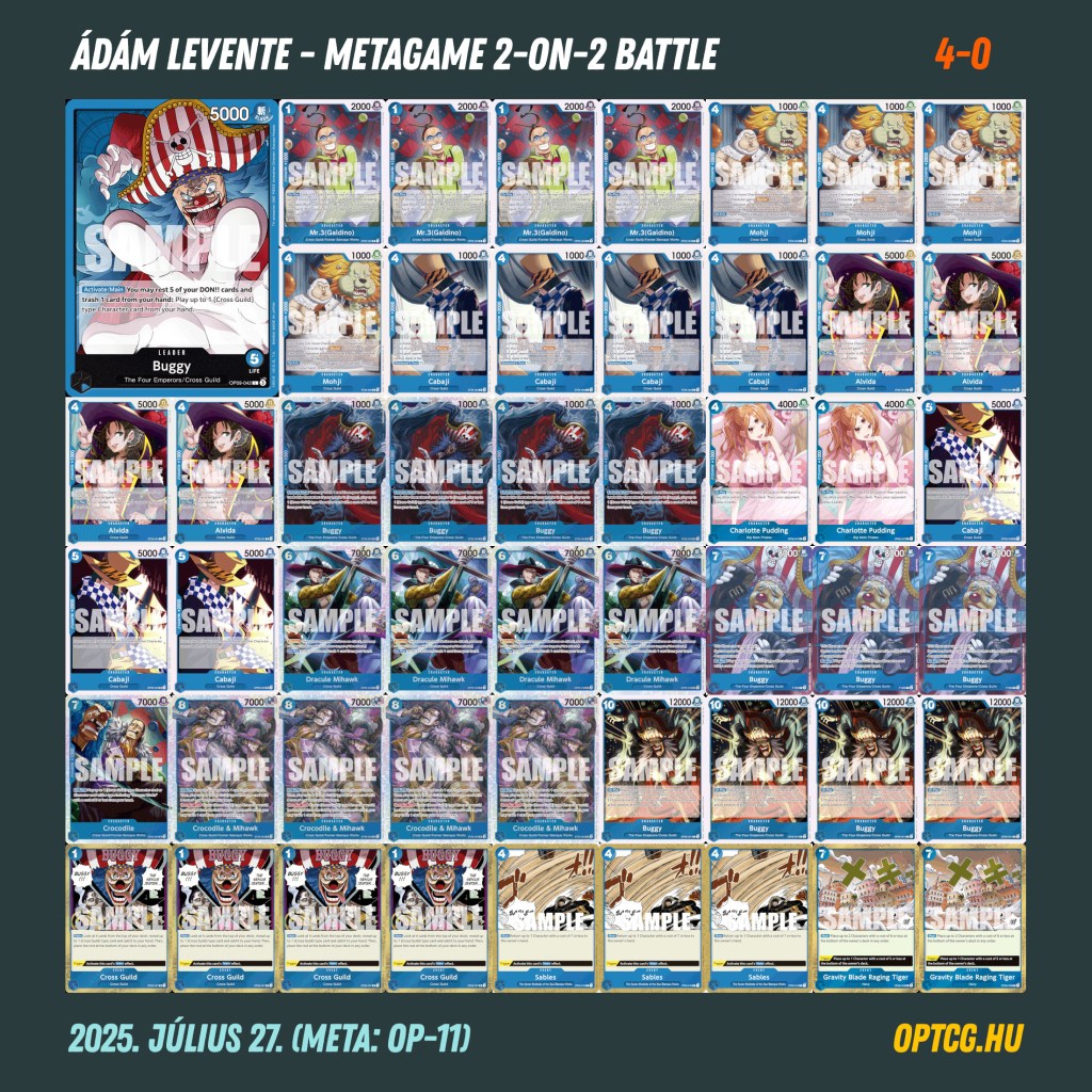 Július 27-én, vasárnap a második 2-on-2 versenyét is megrendezte a Metagame, ahol a résztvevők párokba verődve, de továbbra is 1v1 felállásban mérkőzhettek meg egymással. A formátum sajátosságát az adta, hogy a játékosok közösen gyűjtögethették a pontokat: a győzelem minden fordulóban 3, illetve 2 pontot ért fejenként (attól függően, hogy az adott körben éppen melyikük a “kiemelt”). A pakliépítésnél emellett kikötés volt, hogy nem lehet tökéletes színegyezés, így mindenképpen különböző Leadereket kellett hozniuk a játékosoknak.